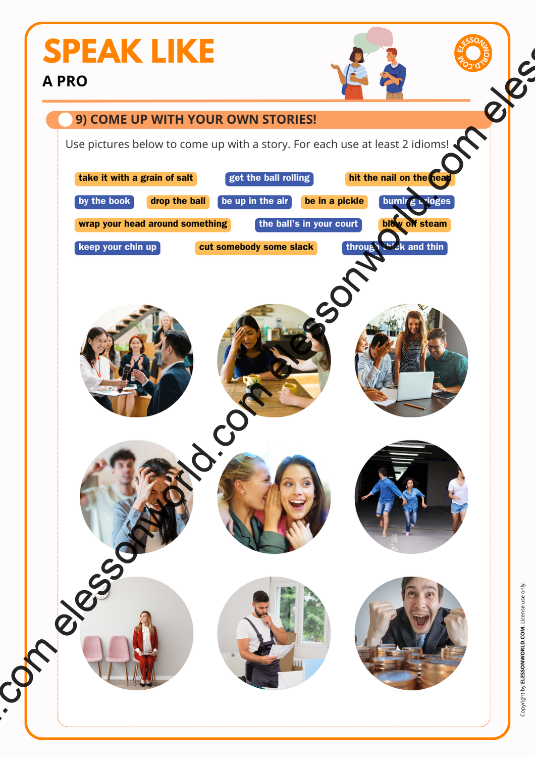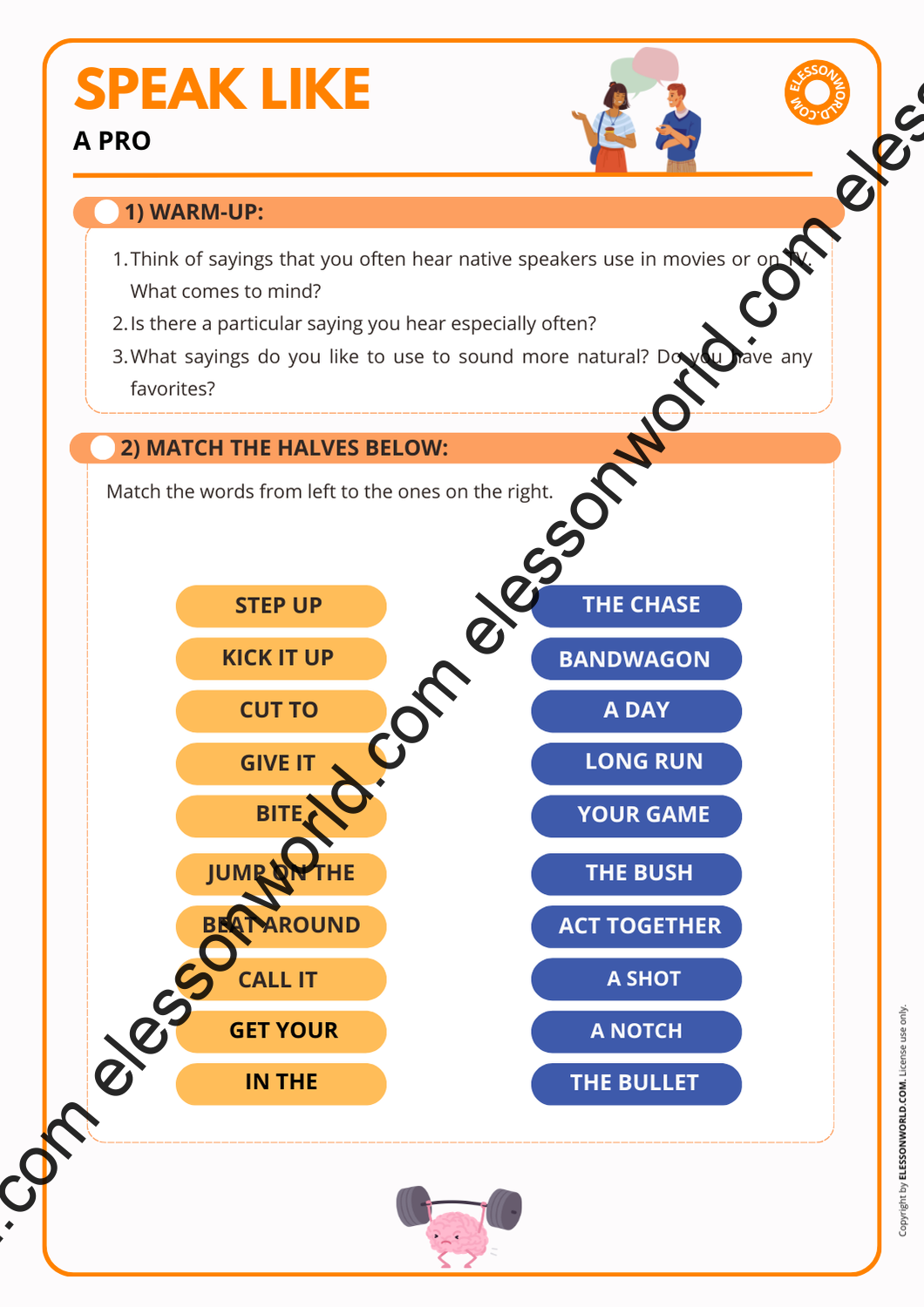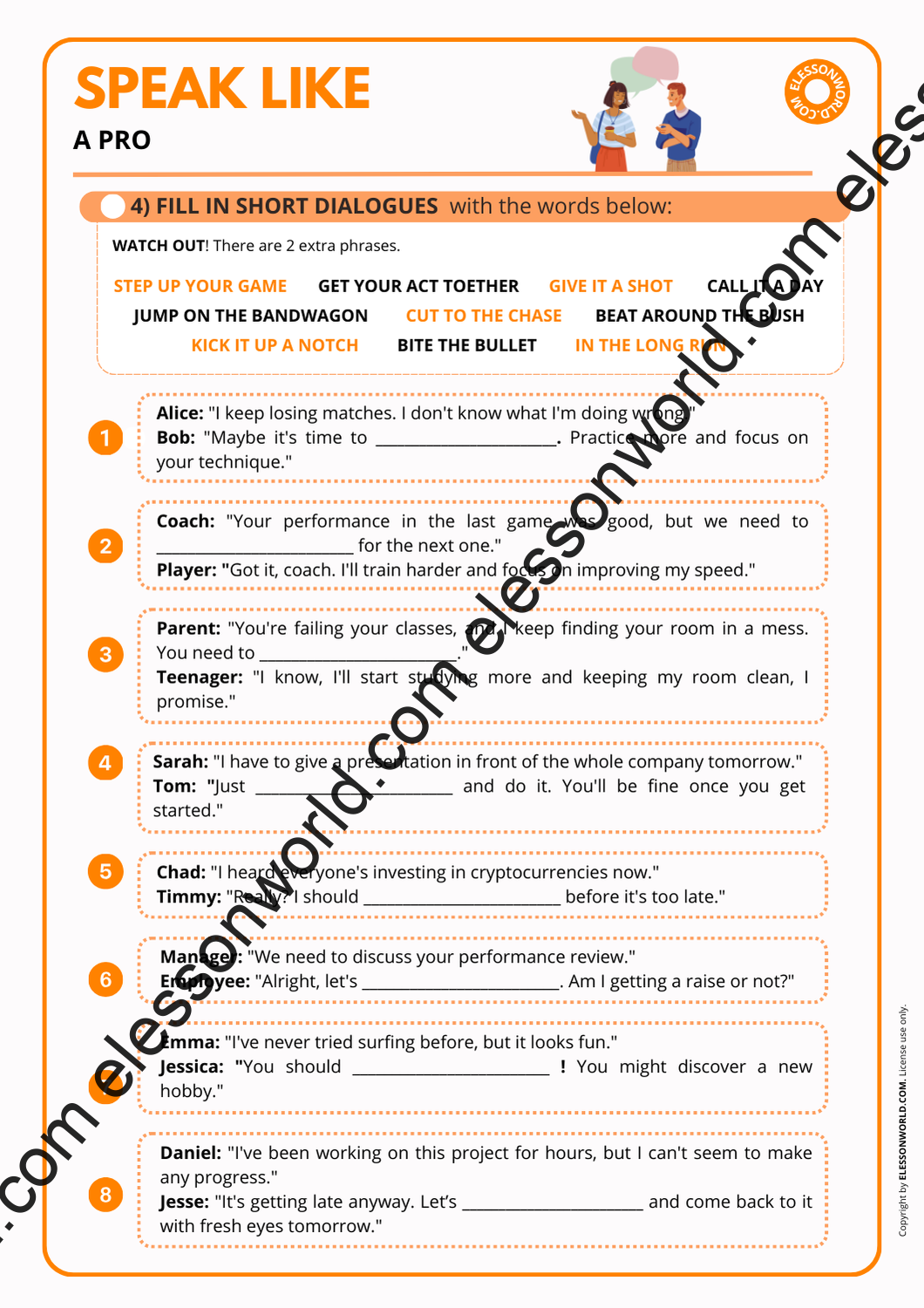 With this lesson, students will learn expressions like ‘step up your game,’ ‘kick it up a notch,’ ‘bite the bullet,’ ‘cut to the chase,’ and many more! Perfect for helping learners sound more fluent and confident in English conversations.