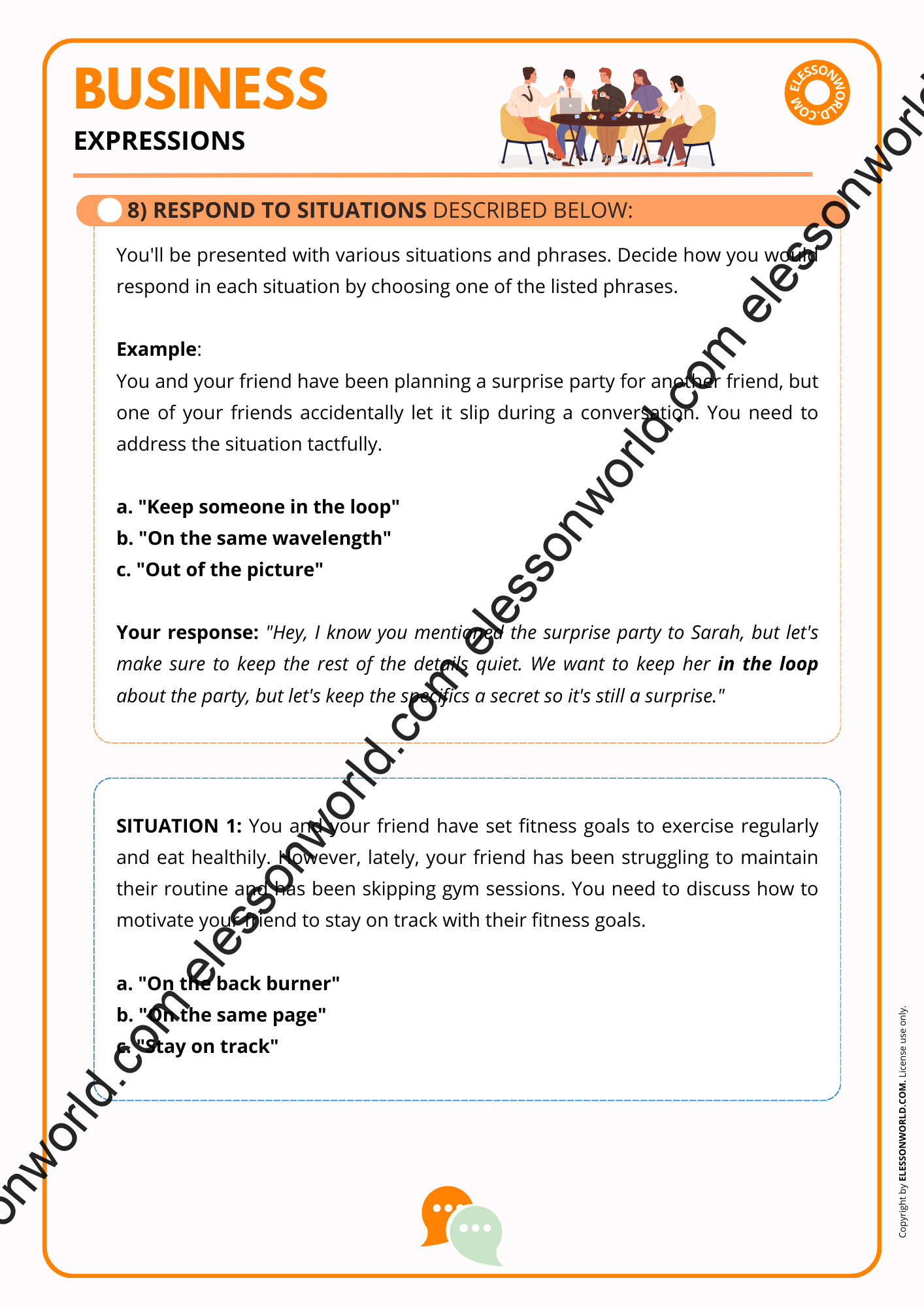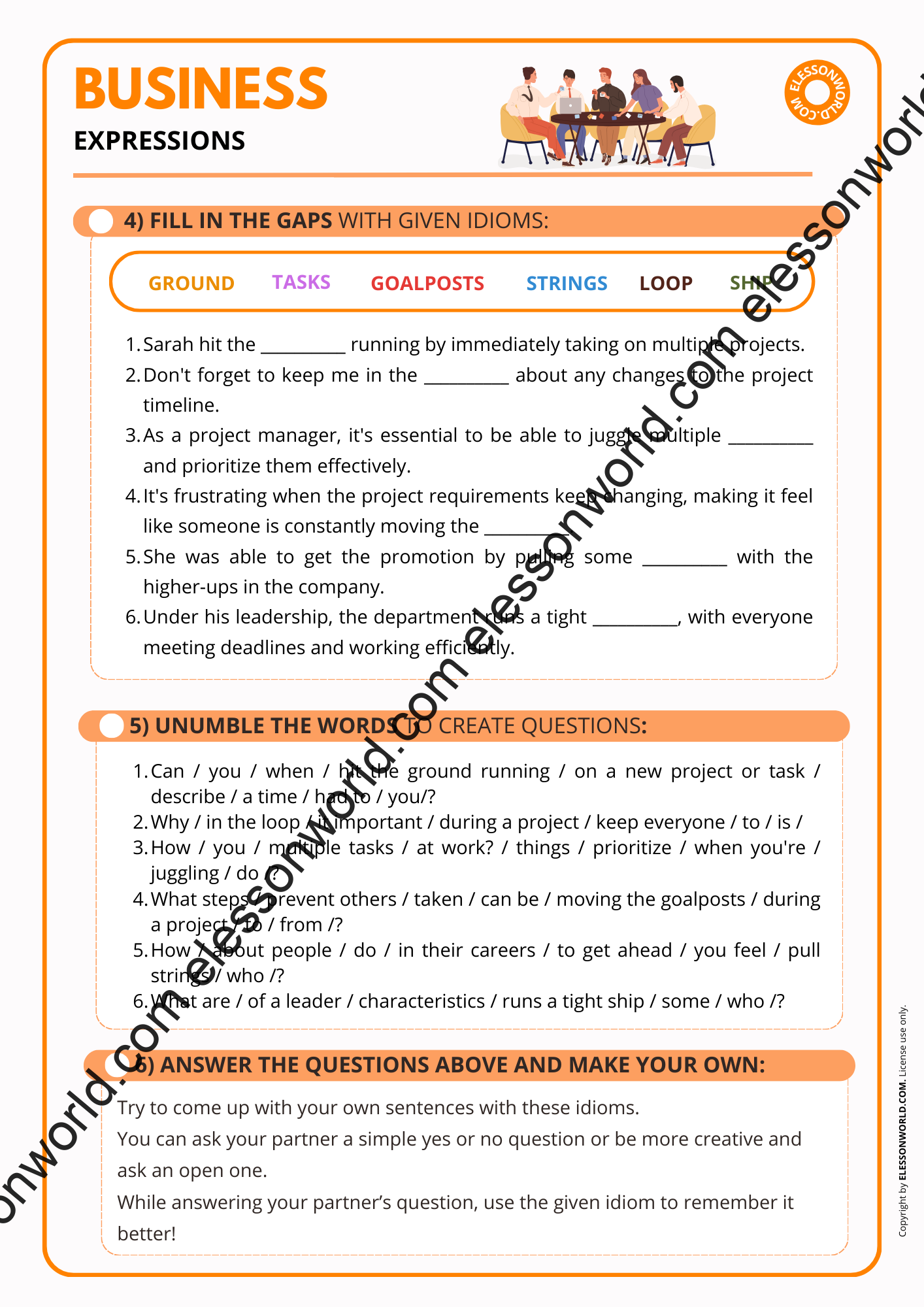 With this lesson students will learn expressions such as “keep somebody in the loop“, “on the same  page“, “move the goalposts“, “out of the equation” and many more!