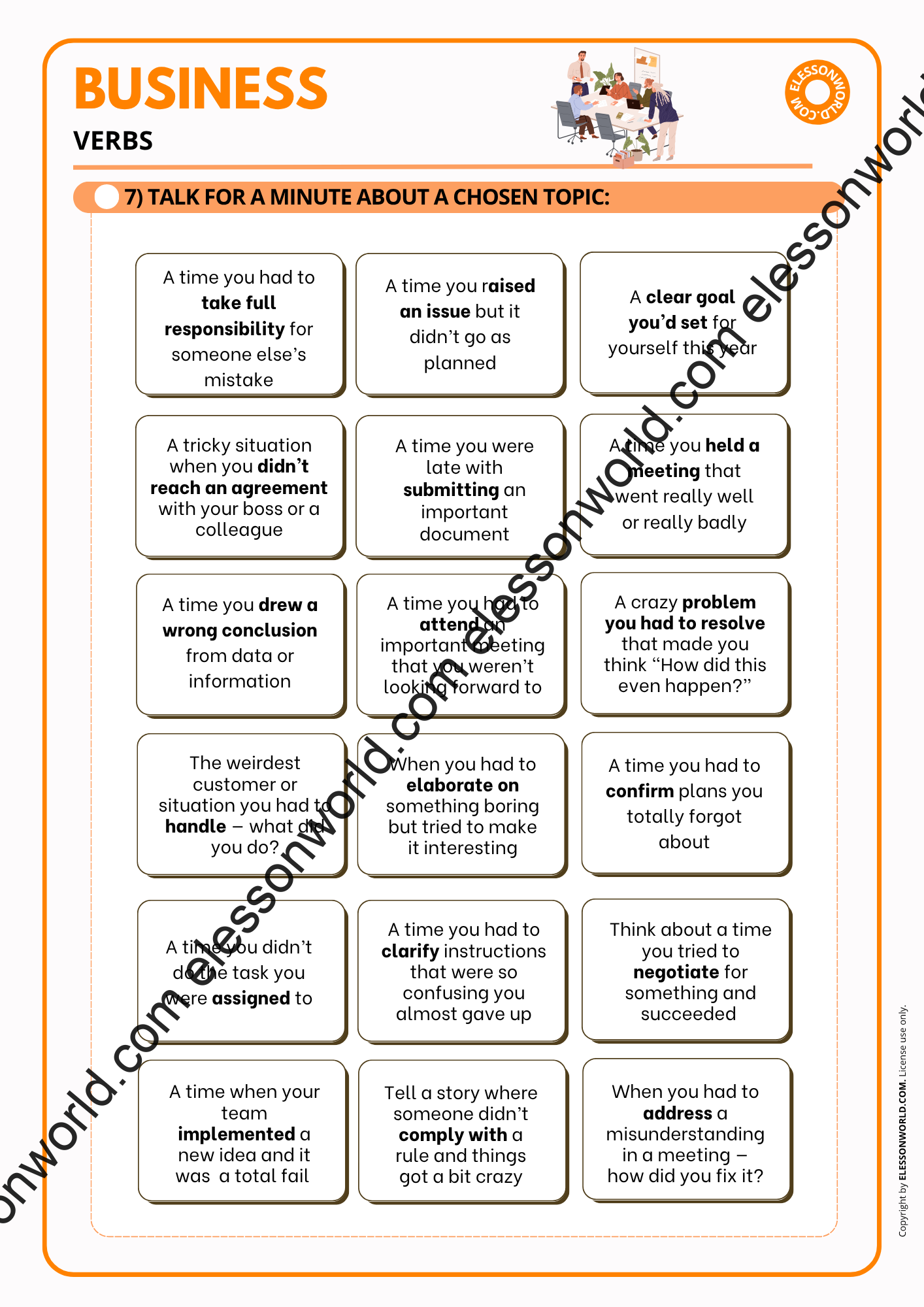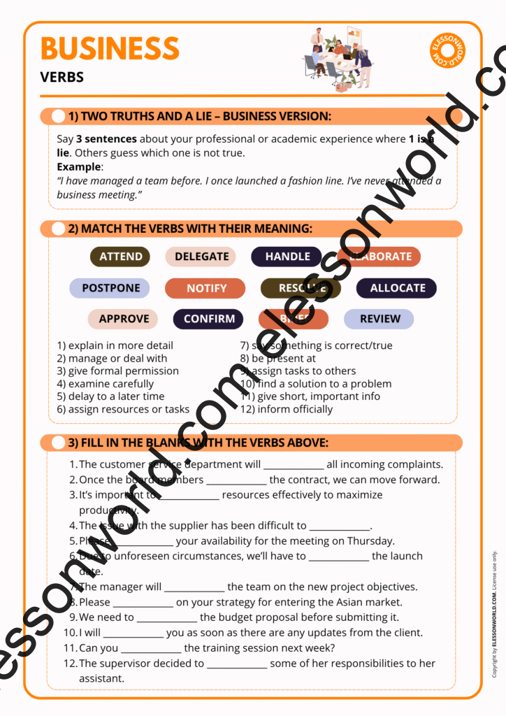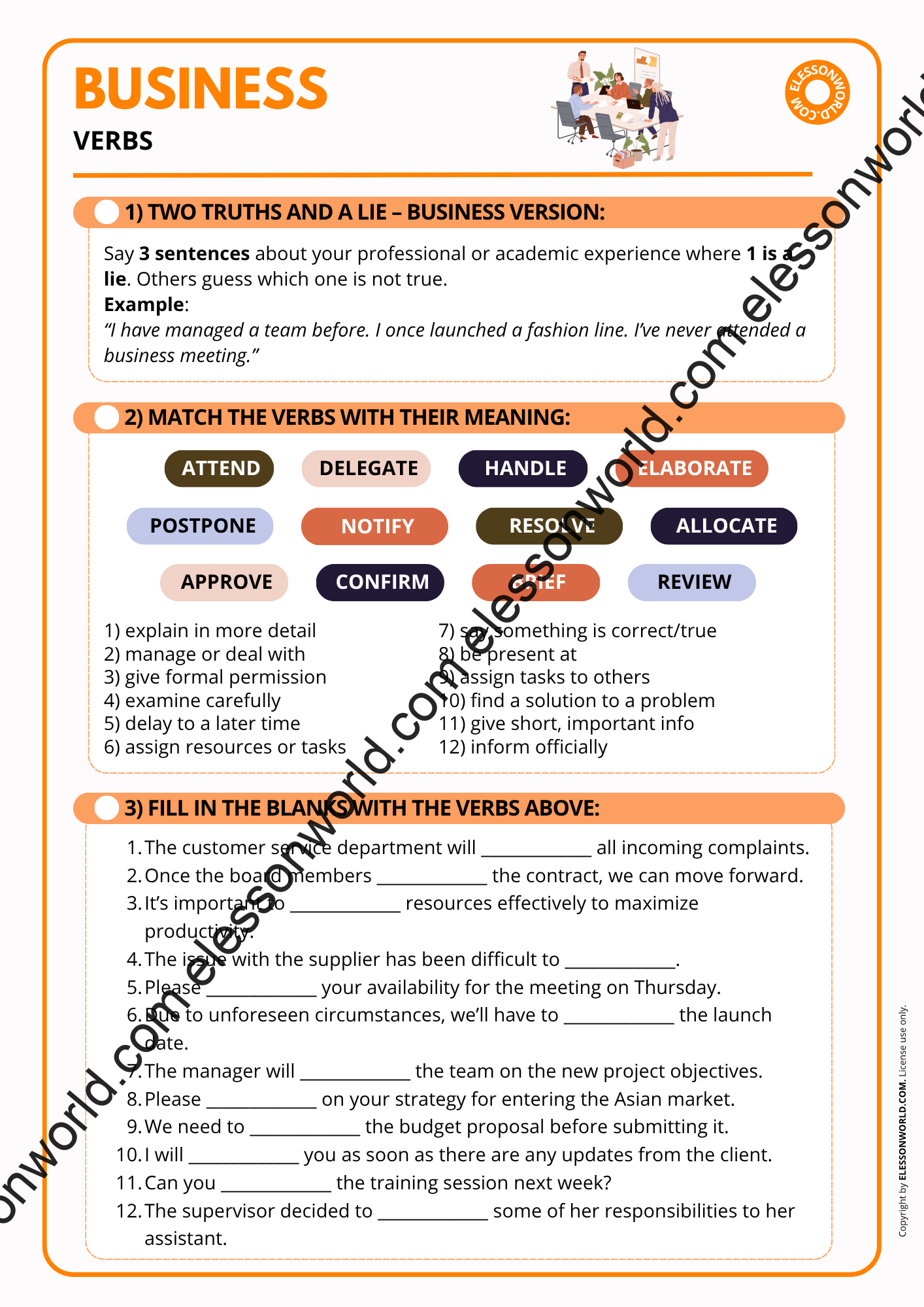 With this lesson, students will build workplace vocabulary with business verbs like delegate, confirm, handle, and negotiate, while practicing useful collocations such as draw a conclusion and set a clear goal through practical speaking, writing, and fluency-based tasks.