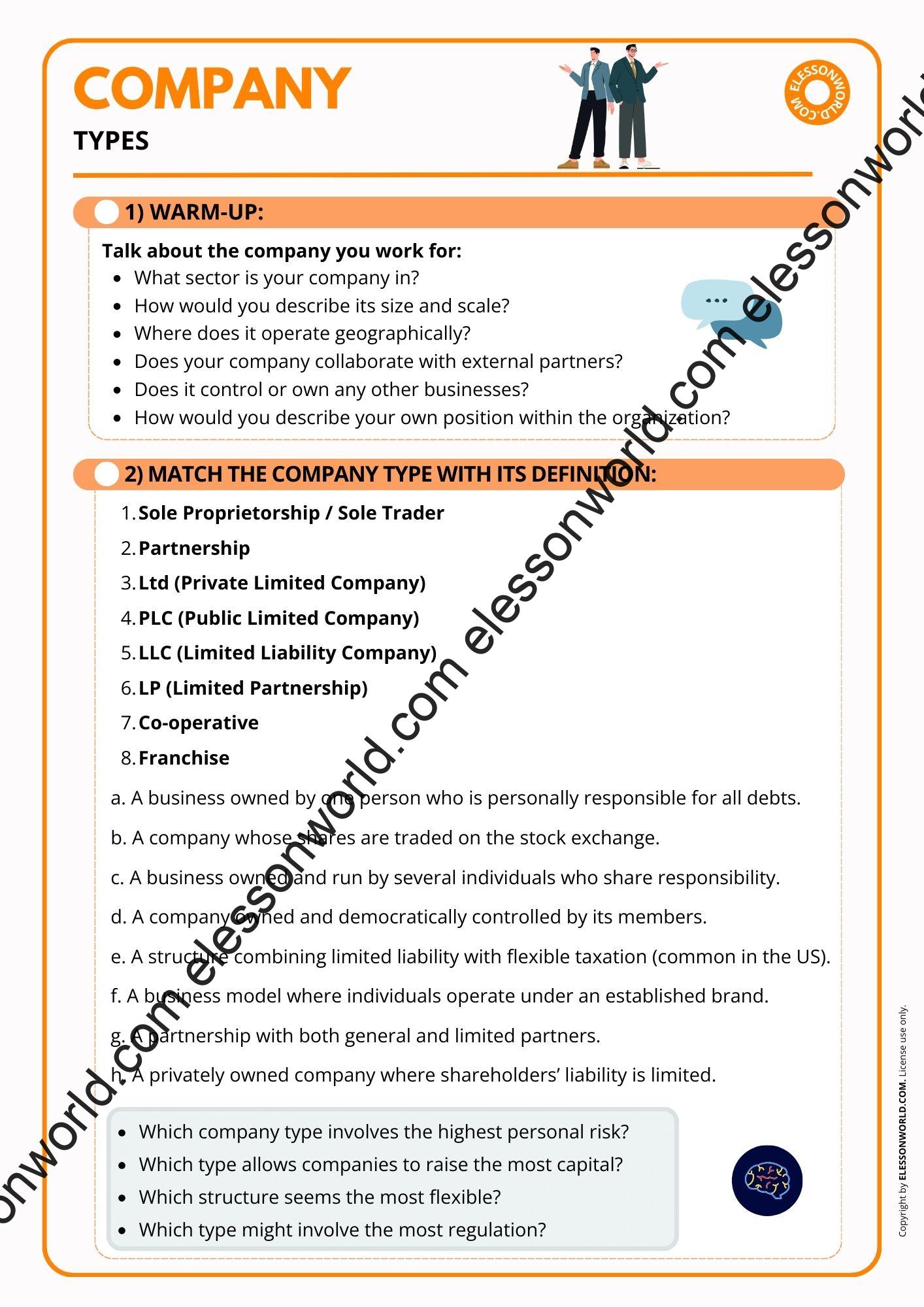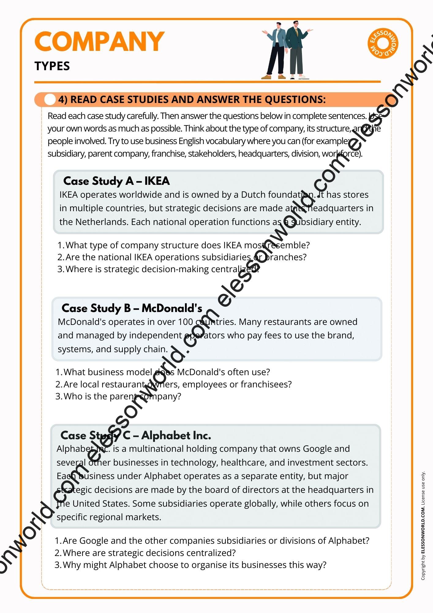 This B2–C1 Business English lesson on company types and corporate structure helps students confidently navigate professional business vocabulary and understand how modern organizations are formed and managed. Through structured tasks, case studies, vocabulary exercises, video exploration, and discussion, learners explore key concepts such as sole proprietorship, LLC, corporation, parent company, subsidiary, franchise, chain of command, and middle management. Students analyze real-world examples including IKEA, McDonald’s, and Alphabet Inc., examining how multinational corporations organize headquarters, subsidiaries, and global operations. The lesson is available in both printable format for traditional classrooms and an online presentation. The user-friendly digital format allows easy navigation in presentation mode with just a click of the spacebar, requiring no additional software.