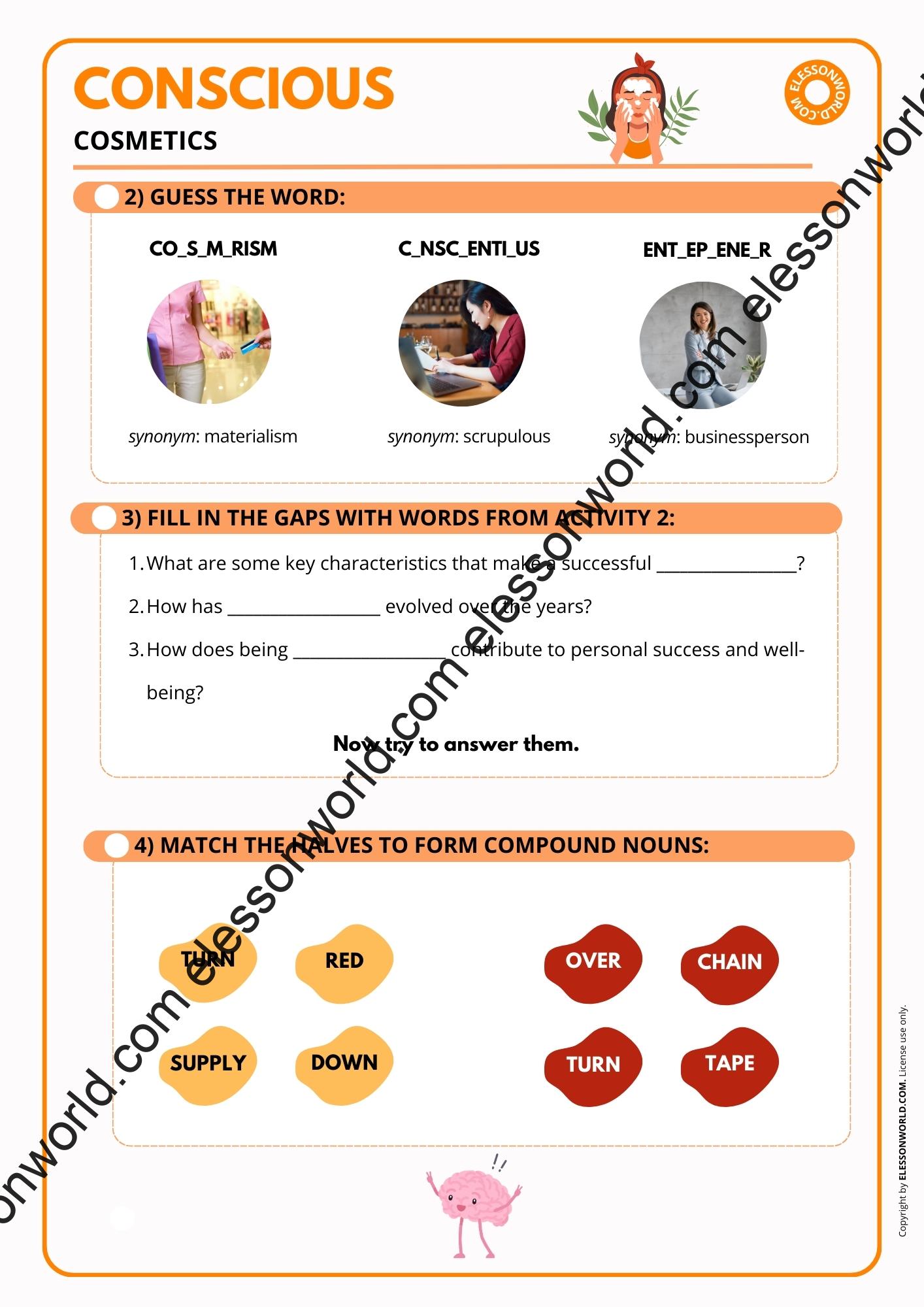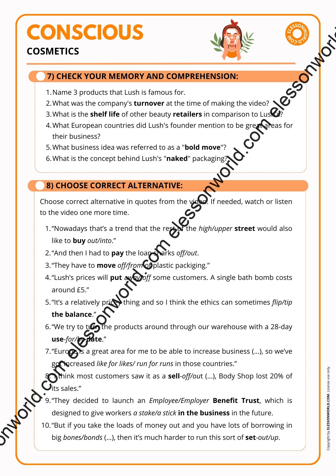 This B1-B2 level ESL lesson explores the rise of conscious cosmetics and ethical consumerism, helping students develop vocabulary, business-related terminology, and discussion skills. The lesson is available in both printable format for traditional classrooms and an online presentation. The user-friendly digital format allows easy navigation in presentation mode with just a click of the spacebar, requiring no additional software.