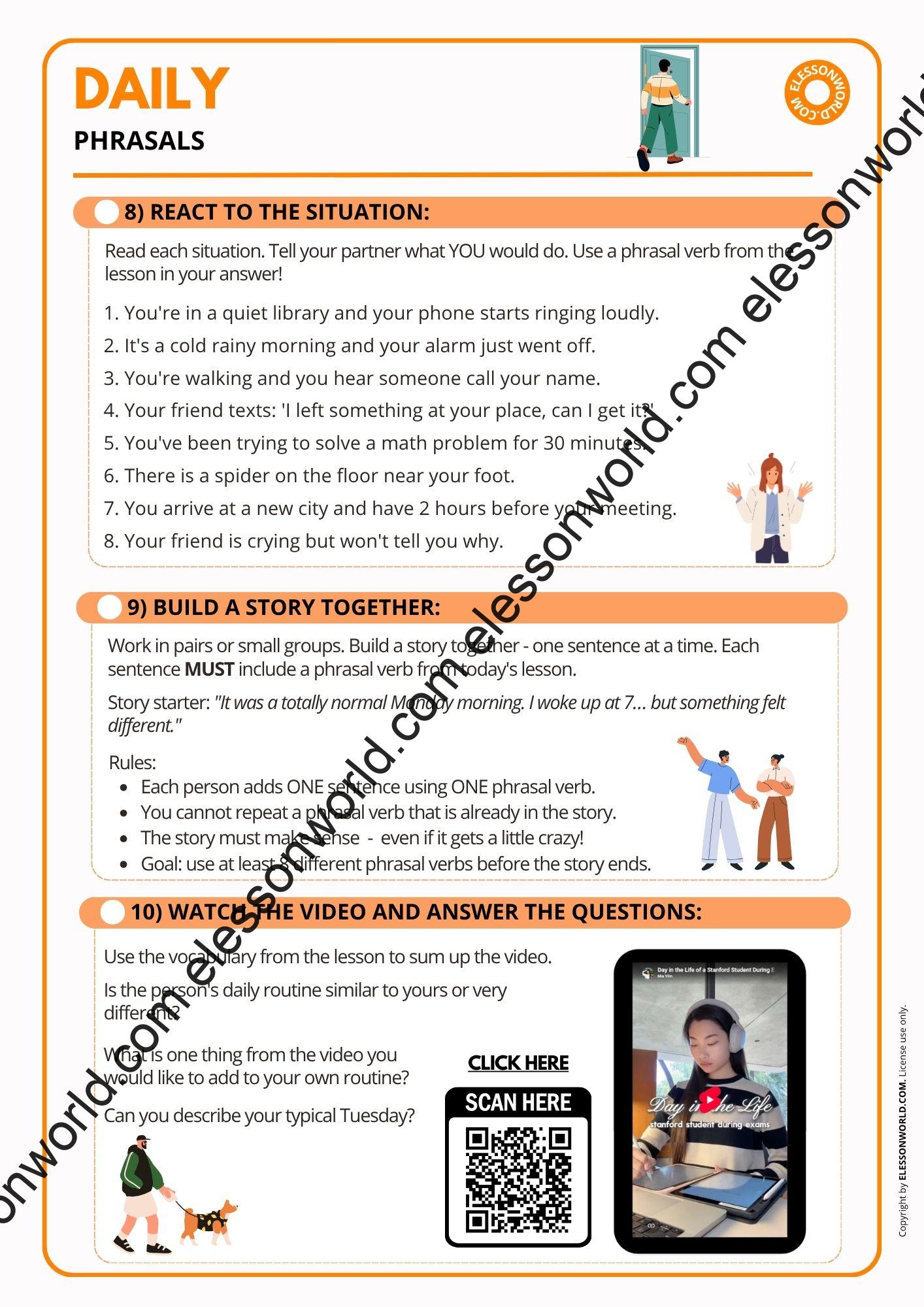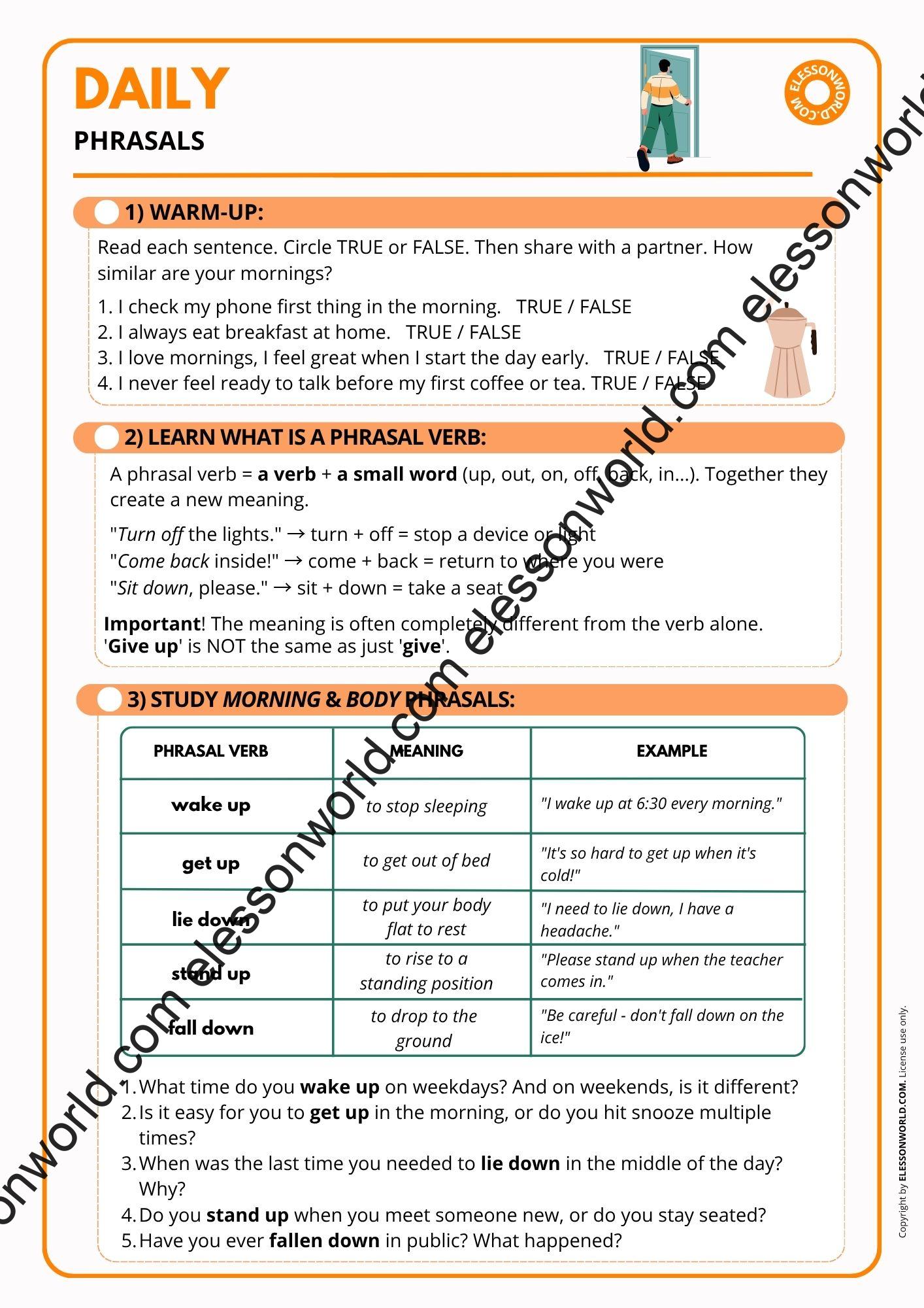 This A1–A2 ESL lesson on everyday phrasal verbs helps students understand and use some of the most common phrasal verbs for daily routines, movement, and everyday actions. Instead of memorizing lists, learners explore phrasal verbs in context and start using them naturally in real-life situations. The lesson moves from simple understanding to active use. Students react to realistic situations, and build short stories using target language. By the end, they’re not just recognizing phrasal verbs, they’re using them confidently in conversation. The user-friendly digital format allows easy navigation in presentation mode with just a click of the spacebar, requiring no additional software.