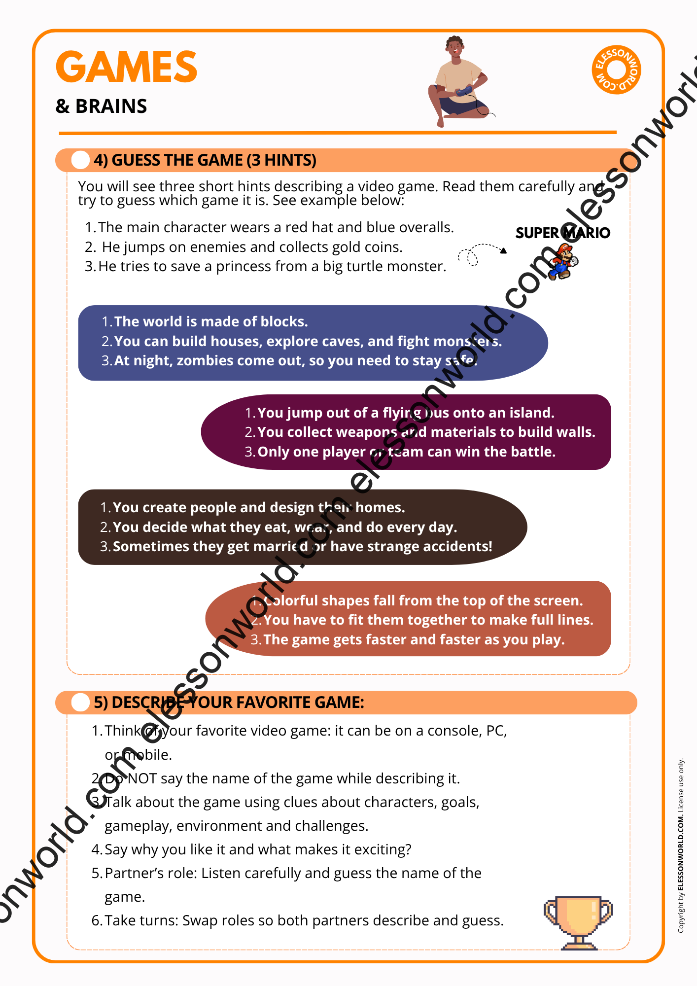 This B1–B2 ESL lesson plan dives into the psychology of gaming and why video games are so captivating. Through engaging discussions, video-based activities, and speaking tasks, students explore how gaming affects the brain, what drives motivation, and why players get hooked. Learners also practice gaming-related terms and idiomatic expressions, gaining the language tools to express opinions, share hobbies, and analyze what makes gaming such a global phenomenon. The lesson is available in both printable format for traditional classrooms and an online presentation. The user-friendly digital format allows easy navigation in presentation mode with just a click of the spacebar, requiring no additional software.