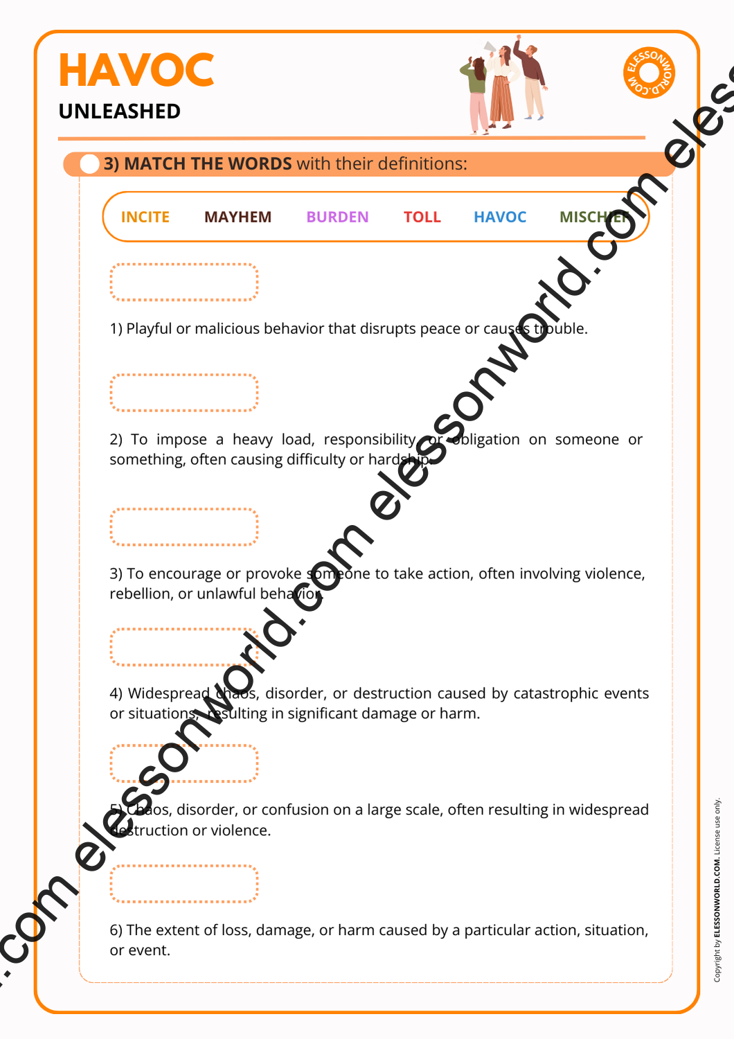 With this lesson, students will learn essential vocabulary related to chaos and disruption, including terms like ‘mayhem,’ ‘wreak havoc,’ ‘take a toll on something,’ ‘incite‘, ‘strike fear‘, and many more! Perfect for helping learners confidently discuss situations of chaos and their impacts in various context.