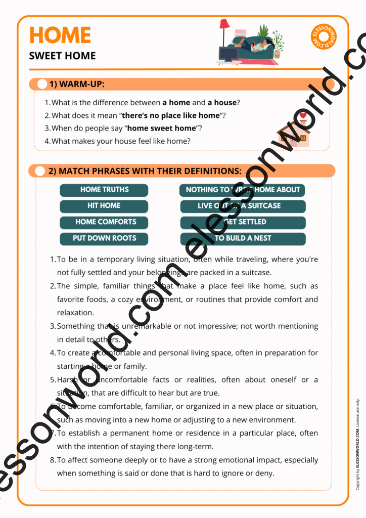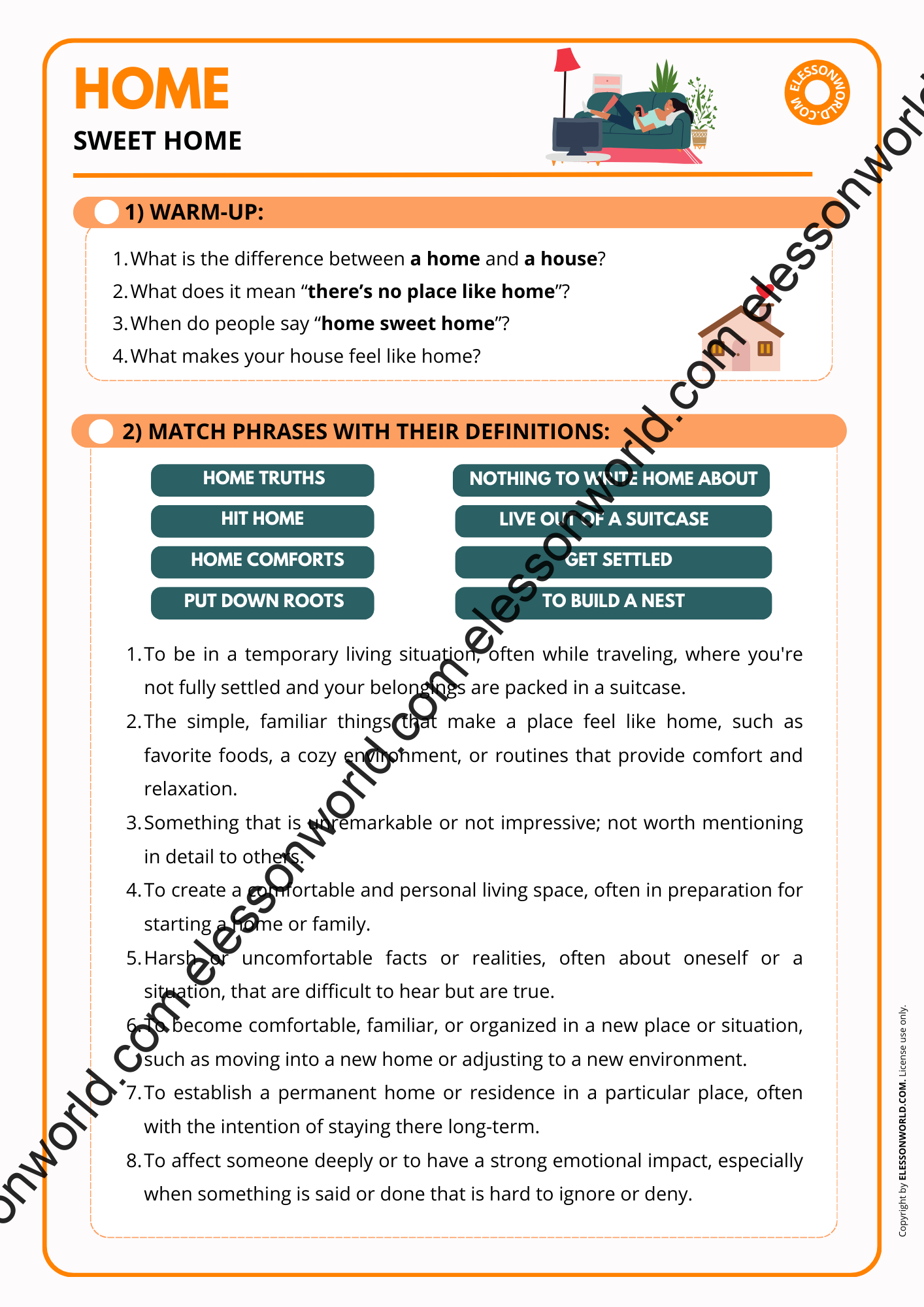 With this lesson, students will explore essential home-related vocabulary, including idioms like home comforts, put down roots, live out of a suitcase, and more! Perfect for helping learners confidently discuss housing, settling down, and what makes a place feel like home in everyday conversations.