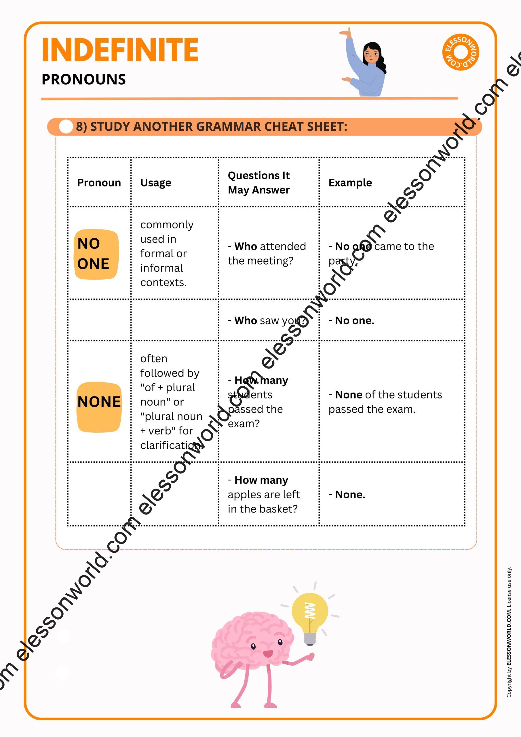 With this lesson, students will master essential indefinite pronouns, including terms like ‘someone,’ ‘anyone,’ ‘no one,’ and ‘everyone.’ Perfect for helping learners confidently use these pronouns in everyday conversations and various contexts.