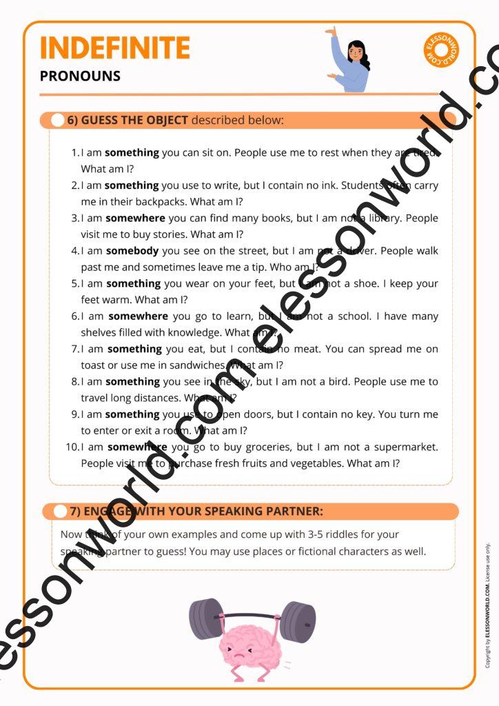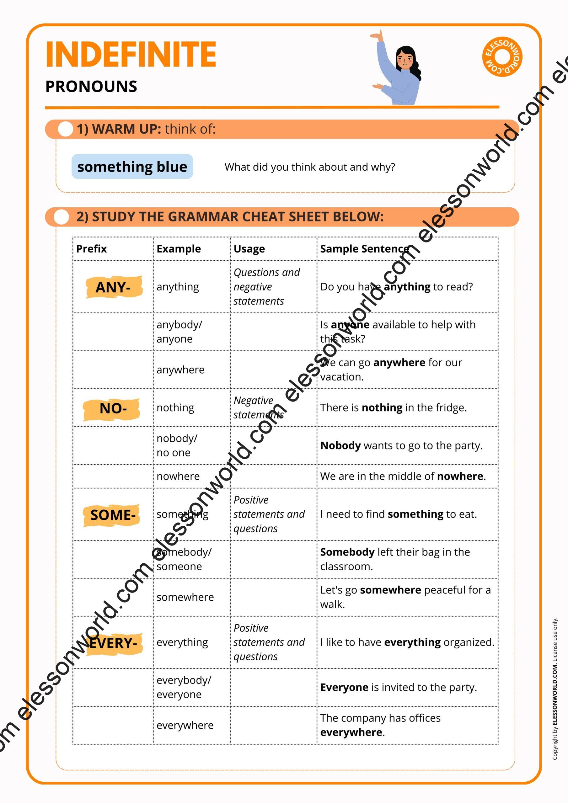 This A2-B1 level ESL lesson focuses on the correct usage of indefinite pronouns in English. Available in both a printable format for traditional classrooms and a digital 16:9 PDF presentation. The user-friendly digital format allows easy navigation in presentation mode with just a click of the spacebar, requiring no additional software.
