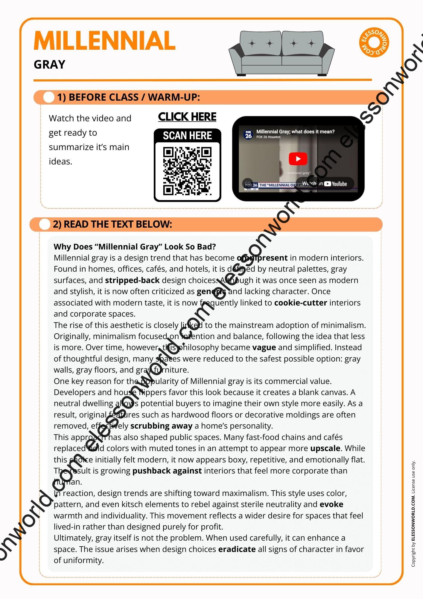 This B2–C1 ESL lesson plan explores the concept of Millennial gray and contemporary interior design trends, encouraging learners to analyze aesthetics, consumer culture, and the emotional impact of design choices. Through in-depth reading, advanced vocabulary work, image-based discussions, and video exploration, students practice descriptive adjectives, and critical-thinking skills. The lesson tackles topics such as minimalism, cookie-cutter interiors, corporate aesthetics, and the shift toward maximalism, making it ideal for discussion-heavy, intellectually engaging ESL classes. The user-friendly digital format allows easy navigation in presentation mode with just a click of the spacebar, requiring no additional software.
