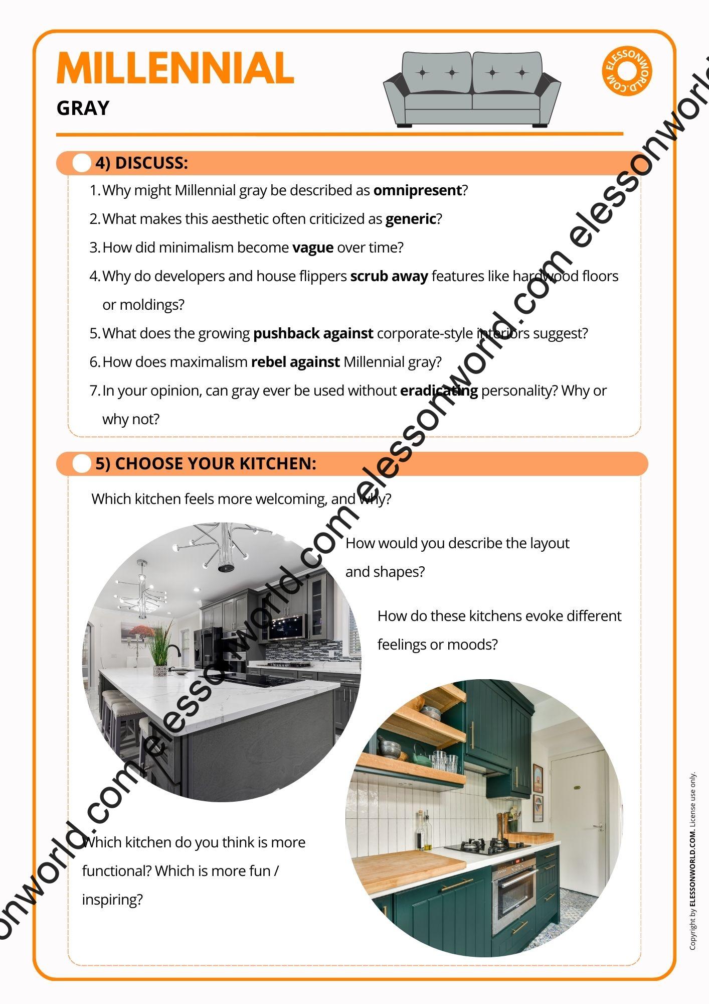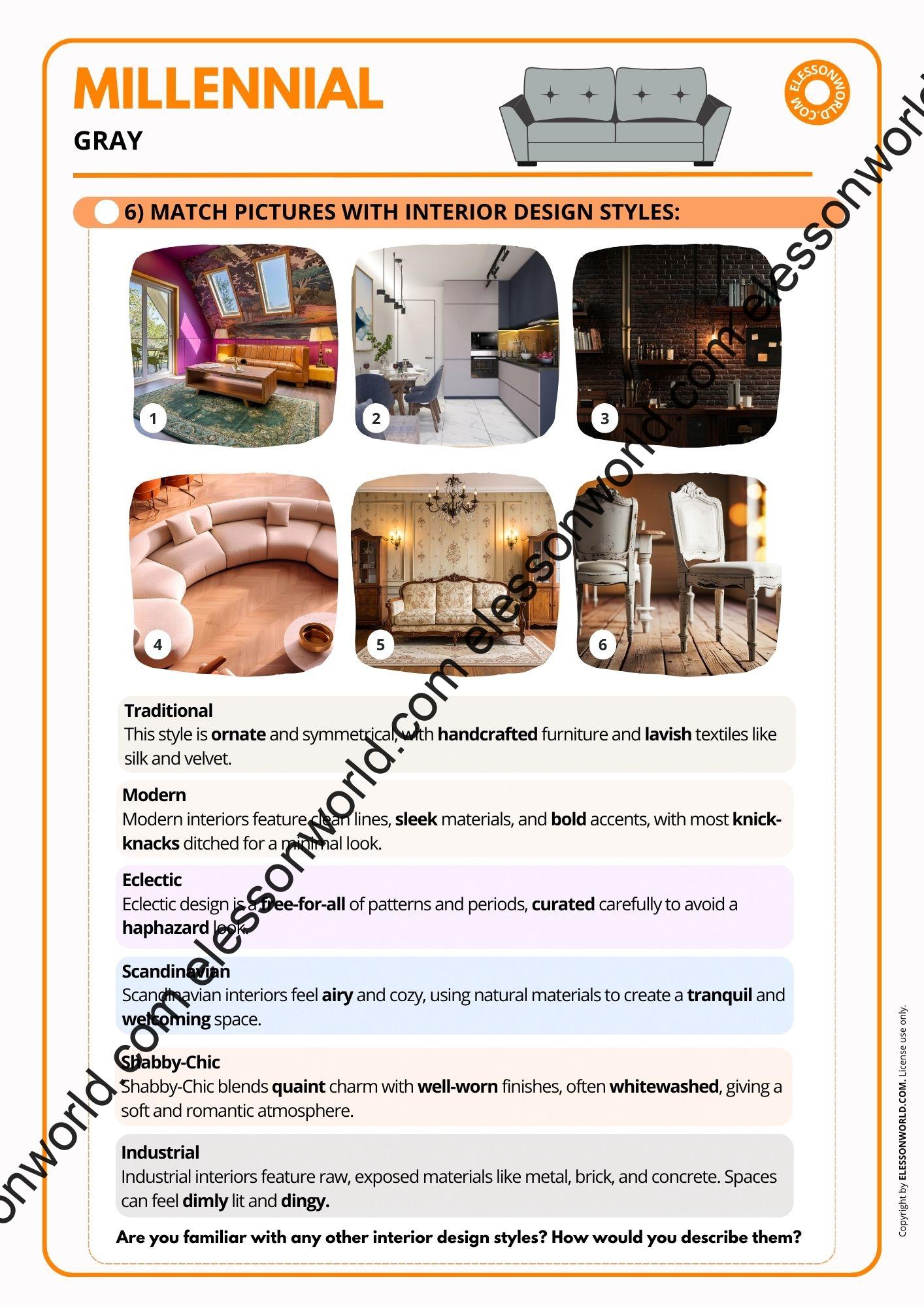 With this B2–C1 ESL lesson on interior design and Millennial gray, students practice expressing nuanced opinions, analyzing cultural trends, and using high-level descriptive language such as generic, vague, omnipresent, haphazard, ornate, sleek, lavish and many more! Ideal for advanced conversation classes and critical-thinking ESL lessons.