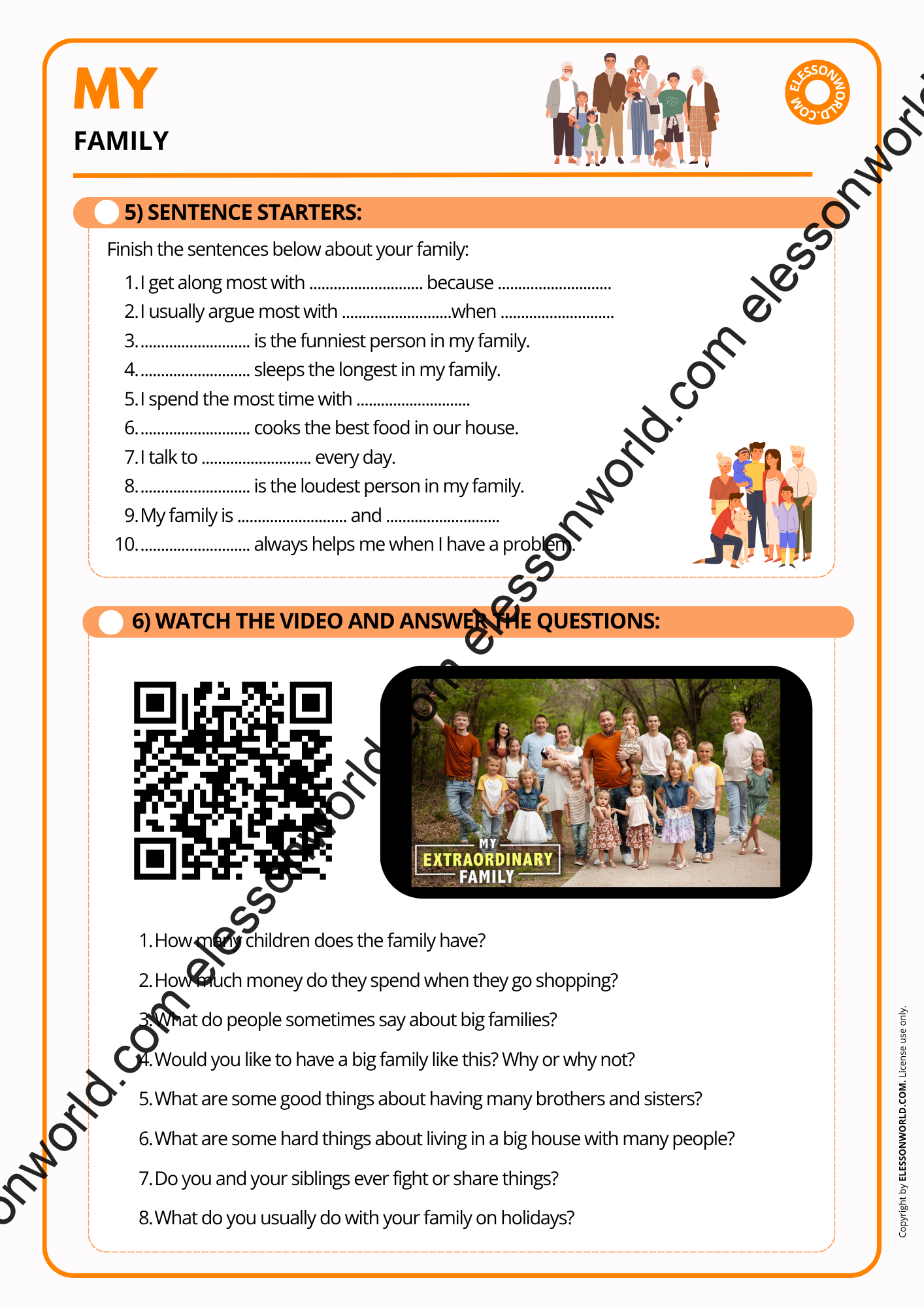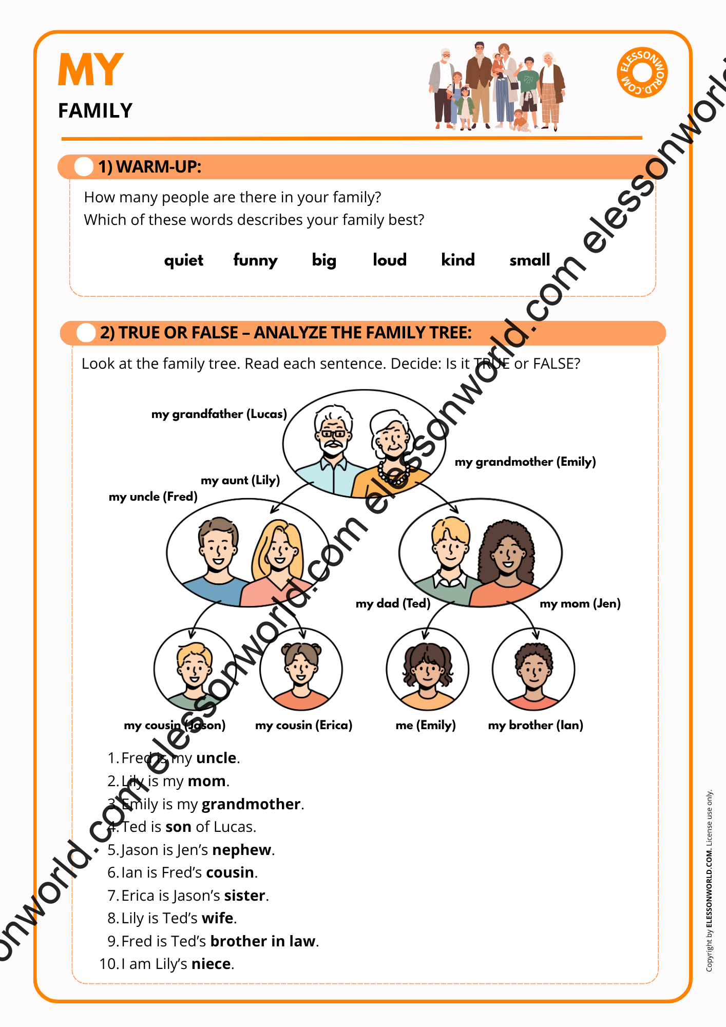 This A1-A2 ESL lesson introduces vocabulary and expressions for talking about family members and relationships through interactive activities. The lesson is available in both printable format for traditional classrooms and an online presentation. The user-friendly digital format allows easy navigation in presentation mode with just a click of the spacebar, requiring no additional software.