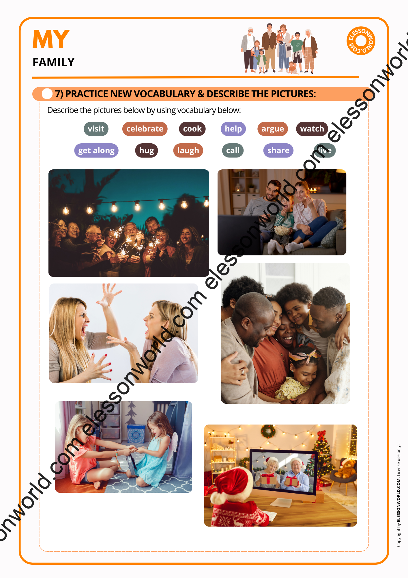 With this lesson, learners will build essential family vocabulary, boost speaking confidence, and sharpen listening skills through games, videos, and quick-fire activities. They’ll not only talk about family members but also bring their sentences to life with action-packed verbs like get along, celebrate, visit, hug, and more. It’s the perfect way to get beginners chatting, laughing, and sharing their own family stories.