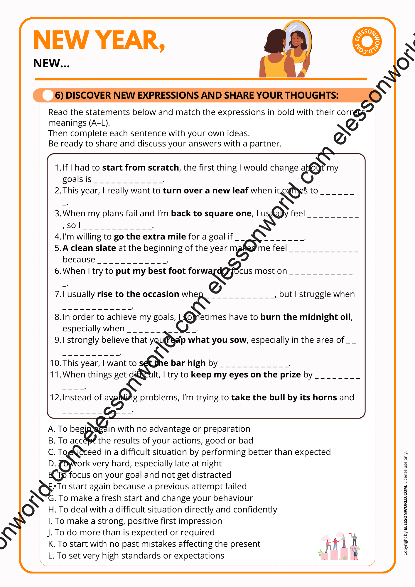 This B2–C1 ESL lesson explores New Year’s resolutions, goal setting, and self-improvement through reflective discussion, advanced vocabulary, idiomatic expressions, and video-based tasks. Students examine why resolutions often fail, how mindset affects success, and how tools like SMART goals and vision boards can support meaningful change. The lesson encourages deep personal reflection while building fluency, accuracy, and confidence in expressing abstract ideas. The user-friendly digital format allows easy navigation in presentation mode with just a click of the spacebar, requiring no additional software.