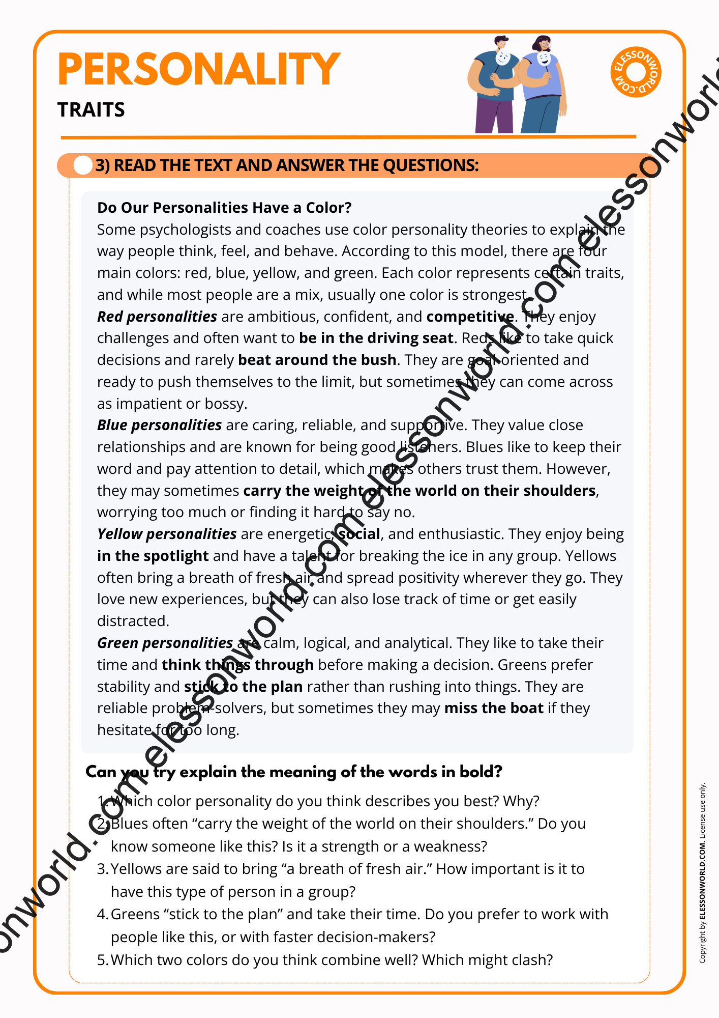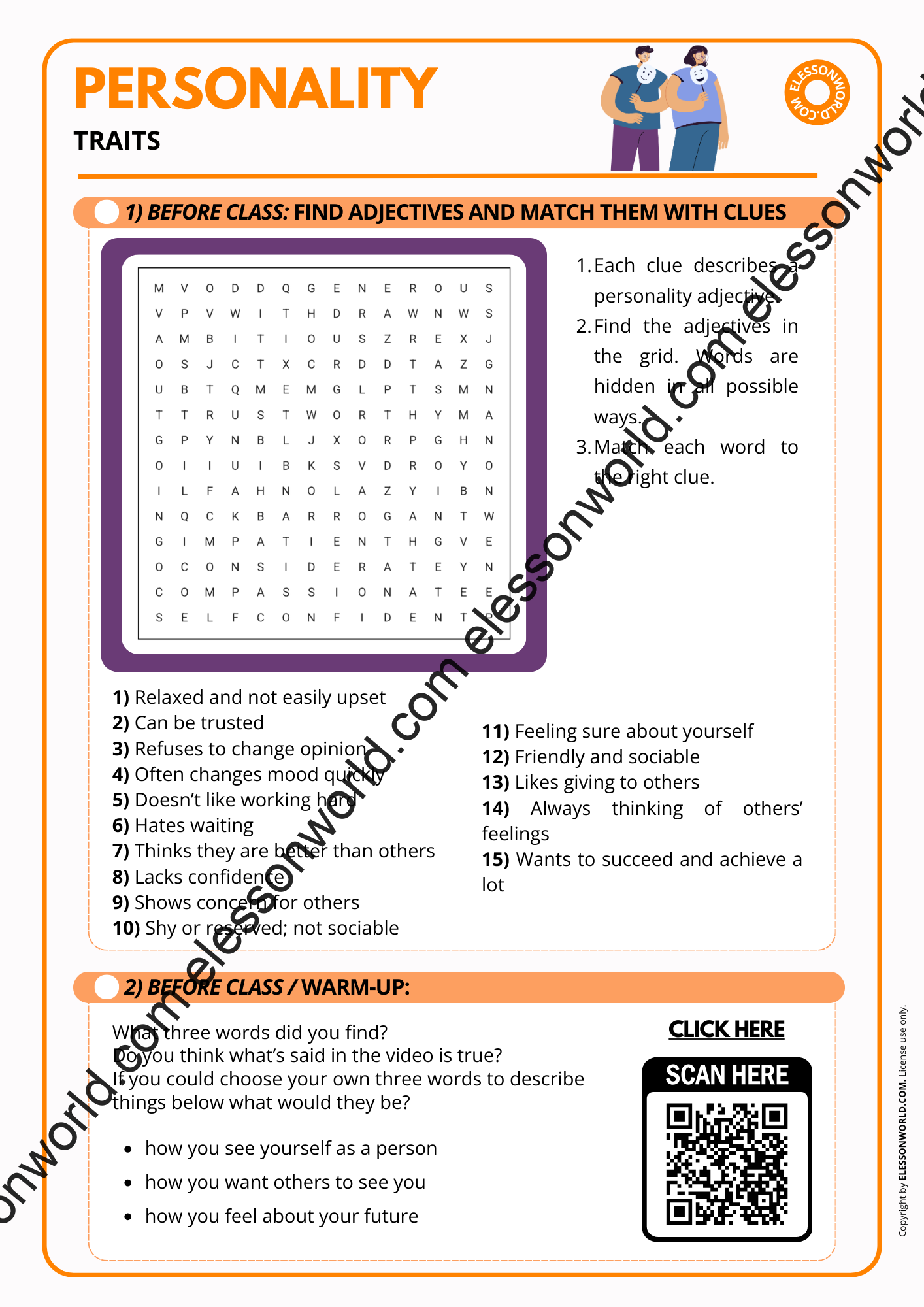 With this lesson, students will master essential personality adjectives and idiomatic expressions to describe people vividly and naturally. They’ll expand their vocabulary with words like stubborn, ambitious, compassionate, and idioms like heart of gold and bundle of nerves, and many more, all while building fluency through discussions, role-plays, and video analysis.