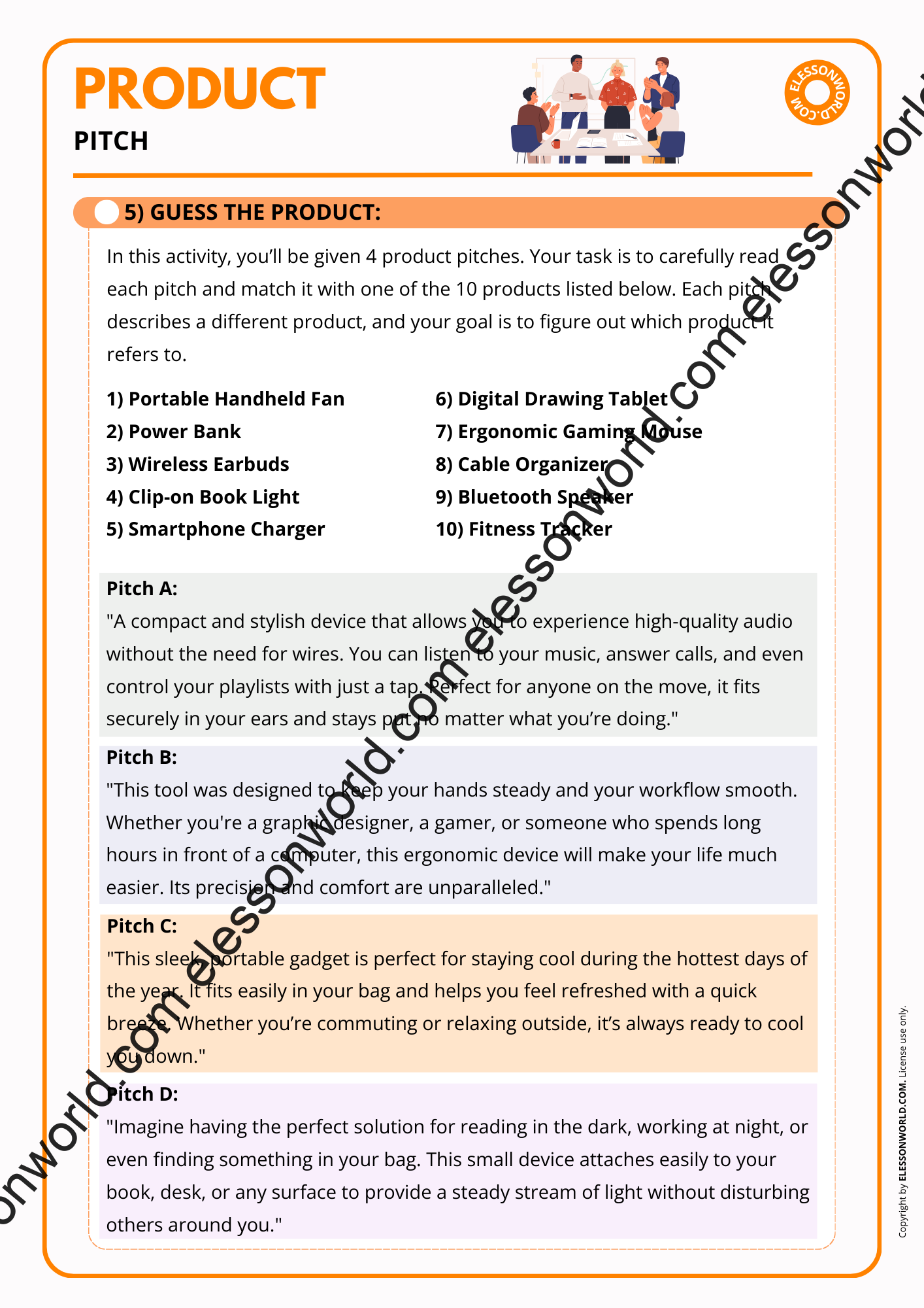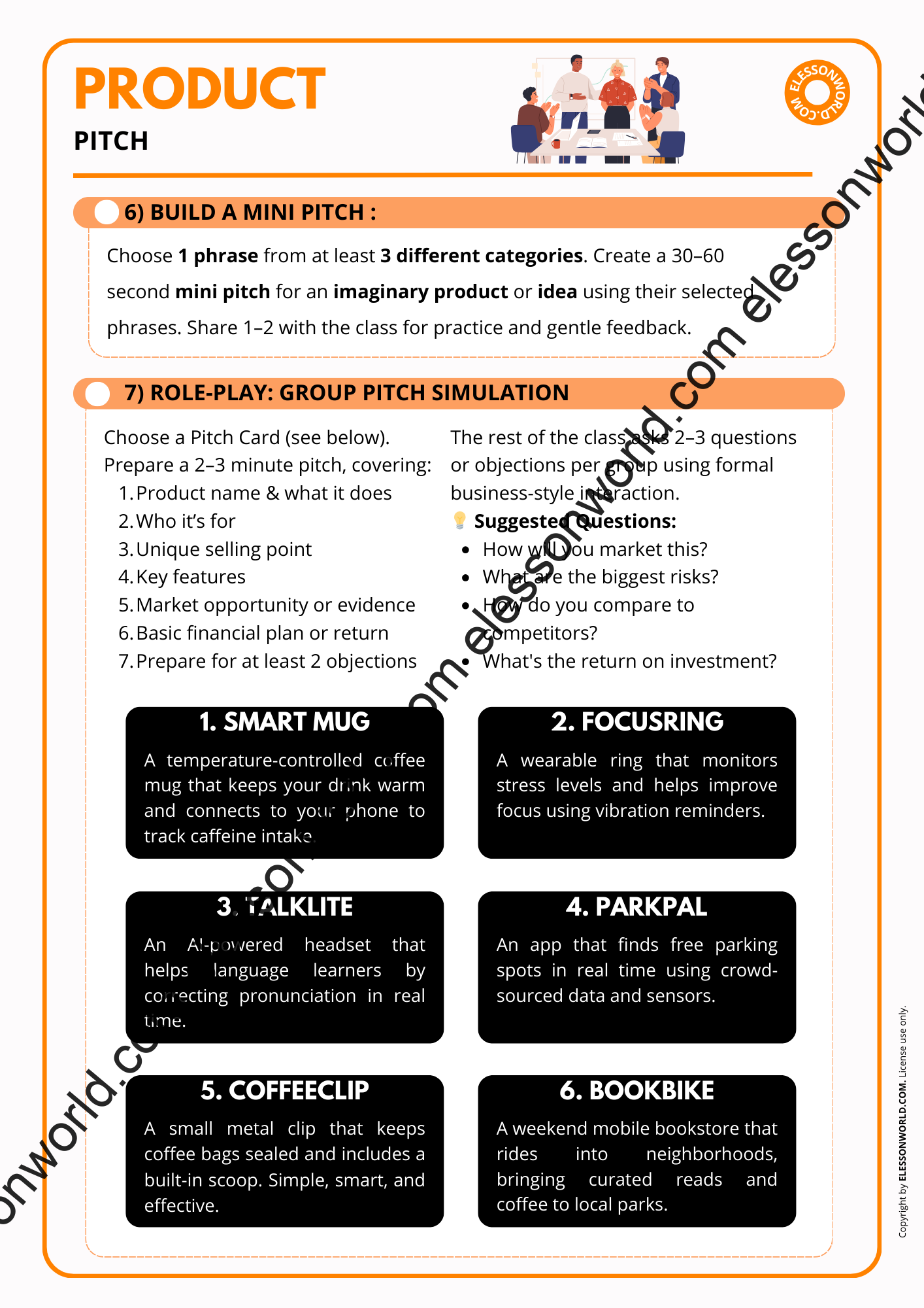 This B2-C1 ESL lesson equips learners with essential business communication skills by teaching them how to craft and deliver a persuasive product pitch. Students explore formal presentation language, persuasive techniques, and vocabulary related to business, innovation, and marketing. Through guided tasks, real-world simulations, vocabulary training, and a video analysis, learners will confidently present, defend, and promote their own product ideas. The lesson is available in both printable format for traditional classrooms and an online presentation. The user-friendly digital format allows easy navigation in presentation mode with just a click of the spacebar, requiring no additional software.