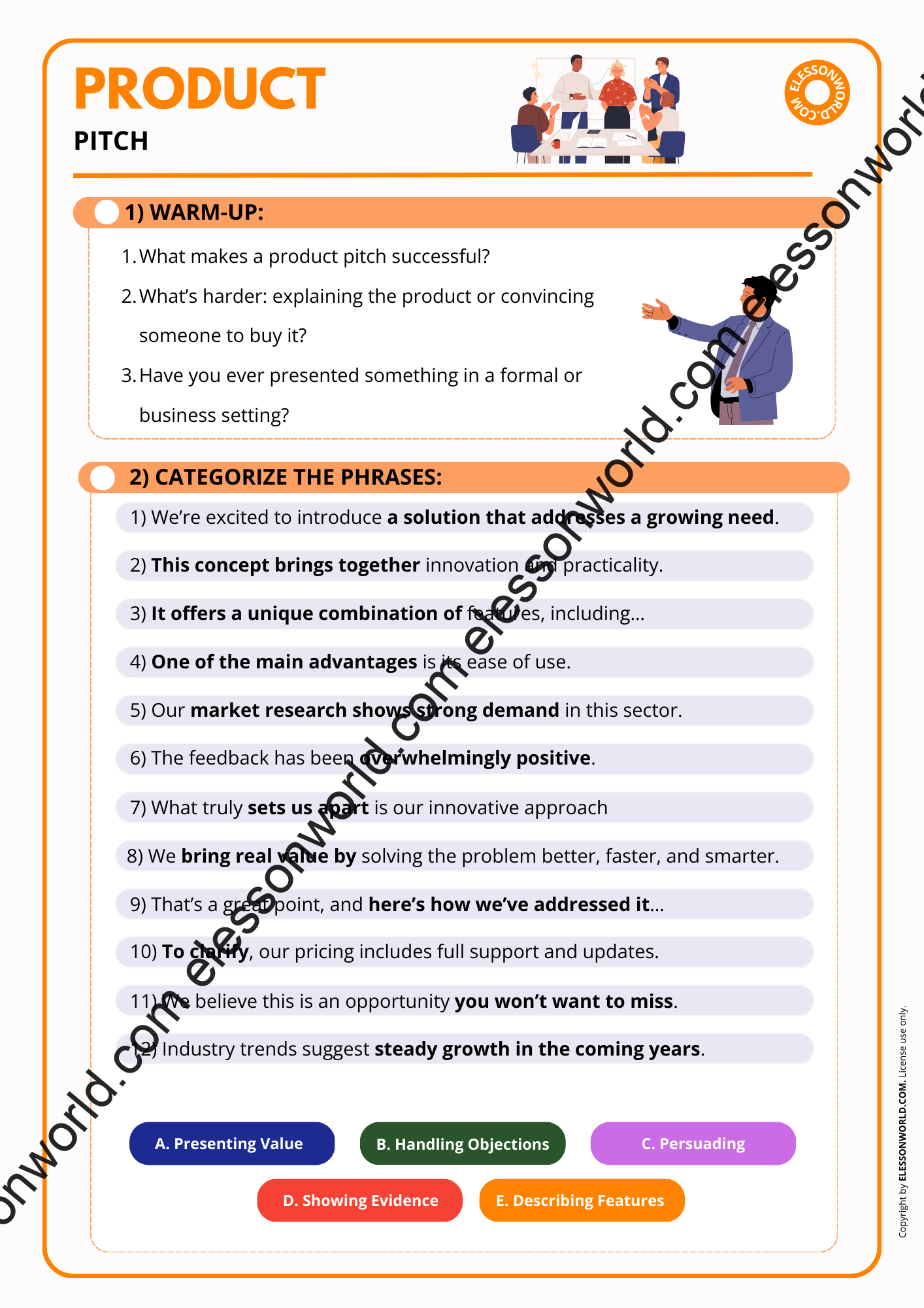 With this lesson, students will master professional pitch language like presenting value, handling objections, and highlighting key features, while developing fluency and confidence in business communication and persuasive speaking.