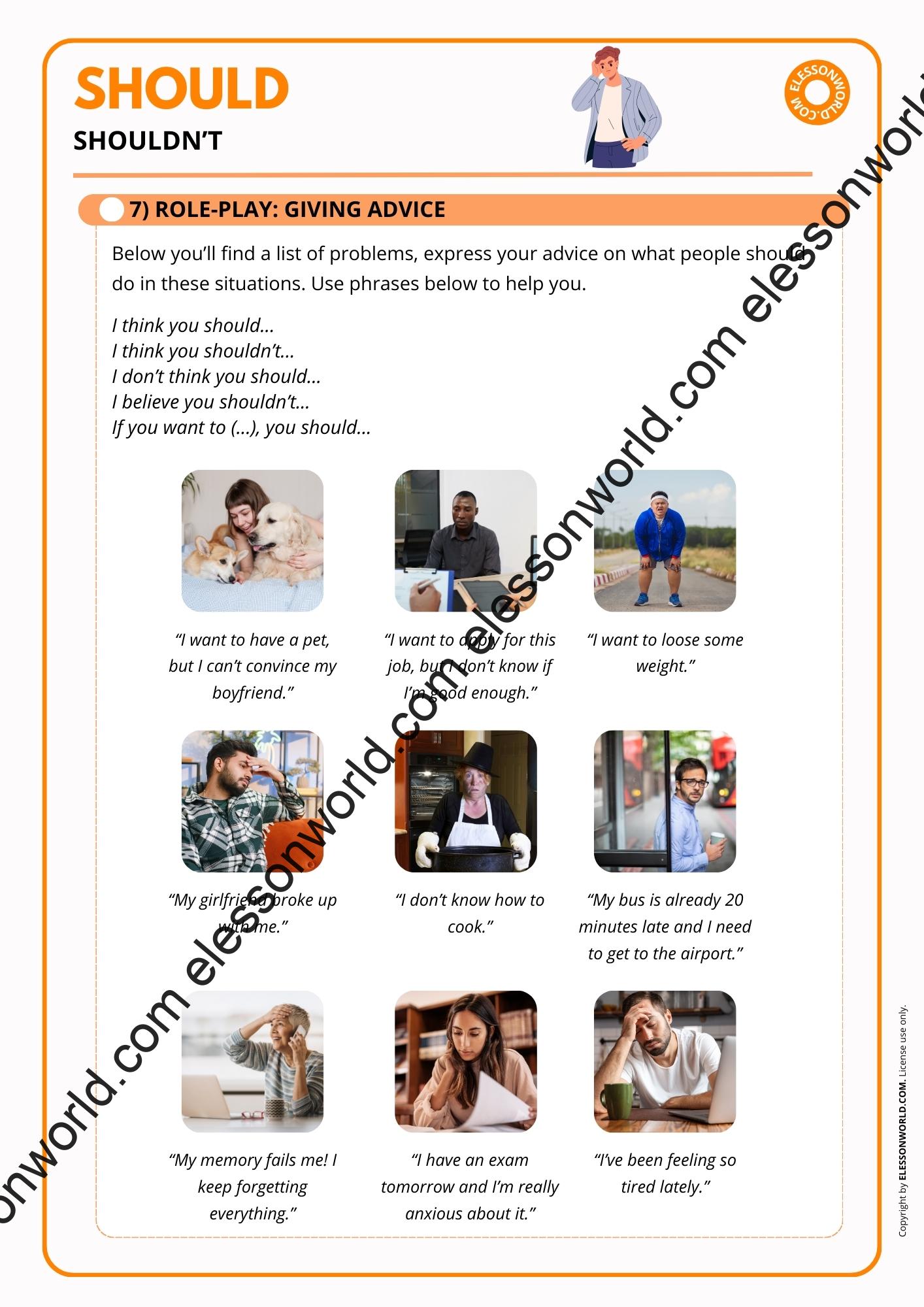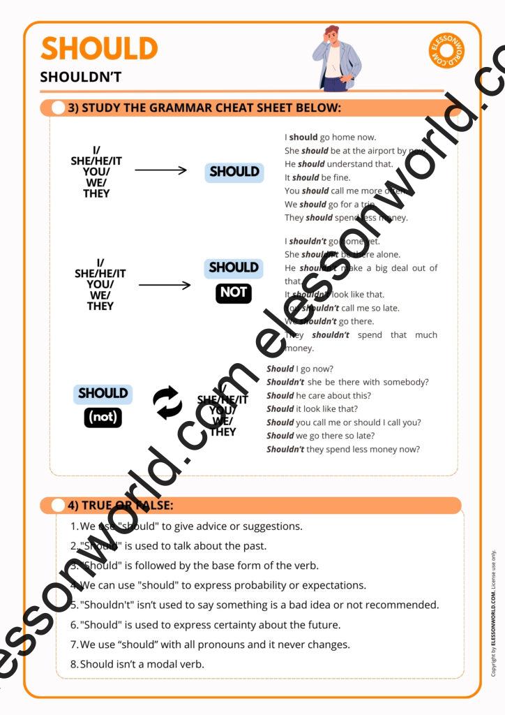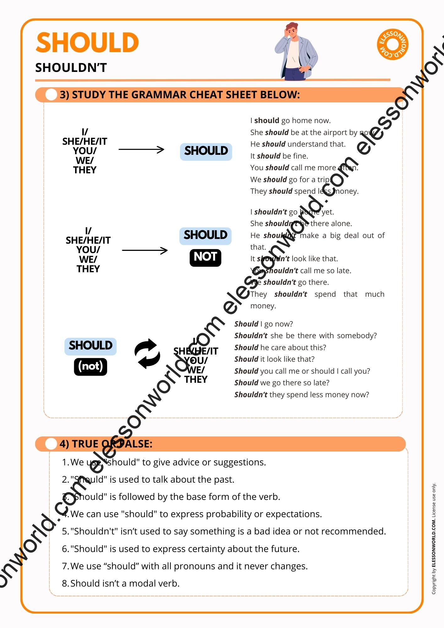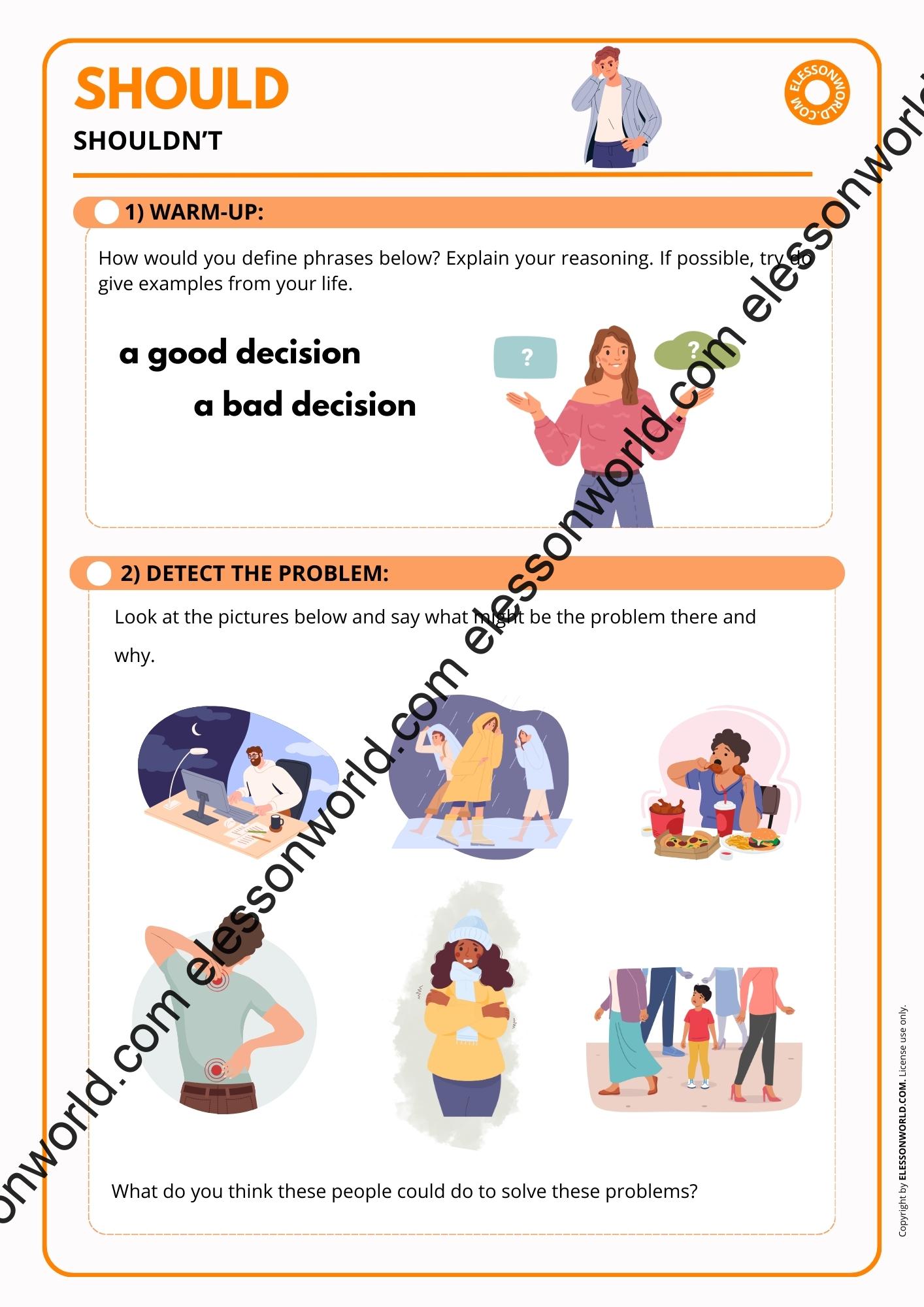 This A2-B1 level ESL lesson teaches students how to use should and shouldn’t to give advice, make recommendations, and express expectations. The lesson is available in both printable format for traditional classrooms and an online presentation. The user-friendly digital format allows easy navigation in presentation mode with just a click of the spacebar, requiring no additional software.