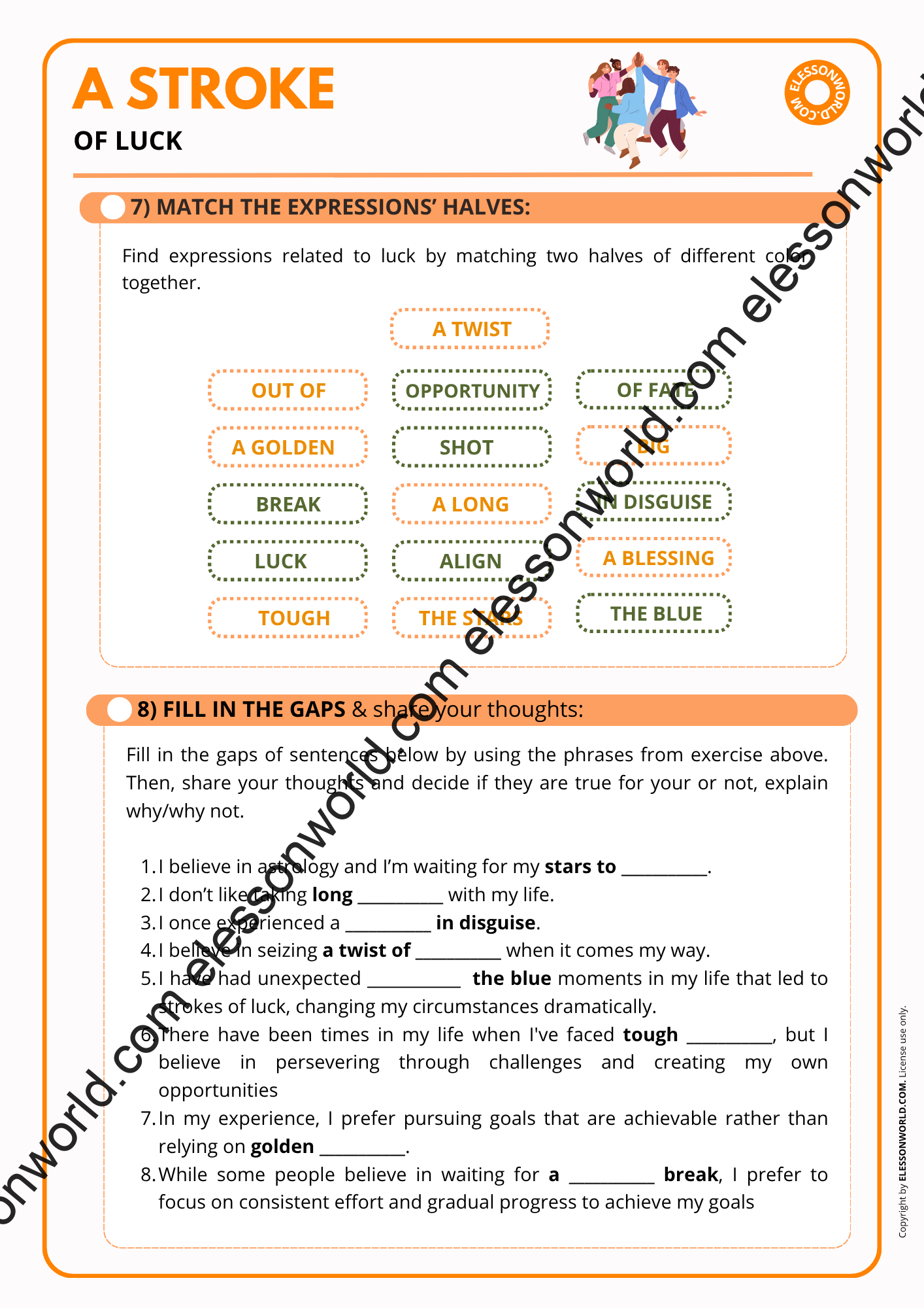With this lesson, students will learn essential expressions related to luck and serendipity, such as ‘big break,’ ‘golden opportunity,’ ‘twist of fate,’ and many more! Perfect for helping learners confidently discuss how chance events impact their lives.