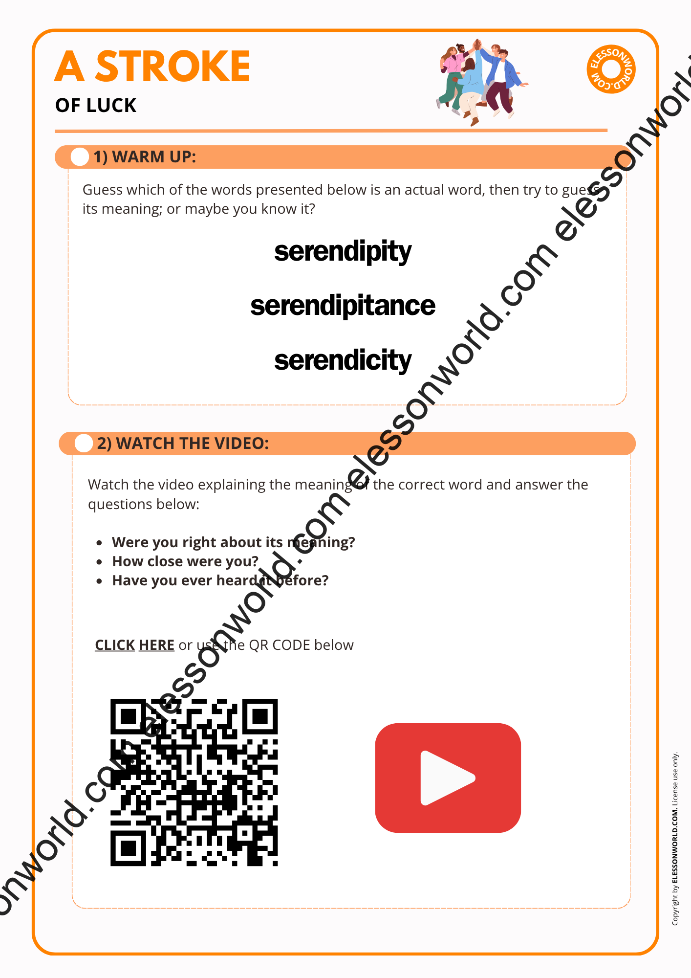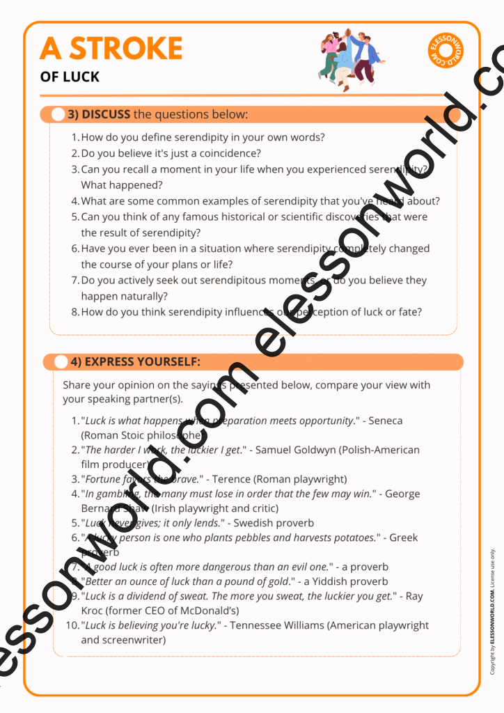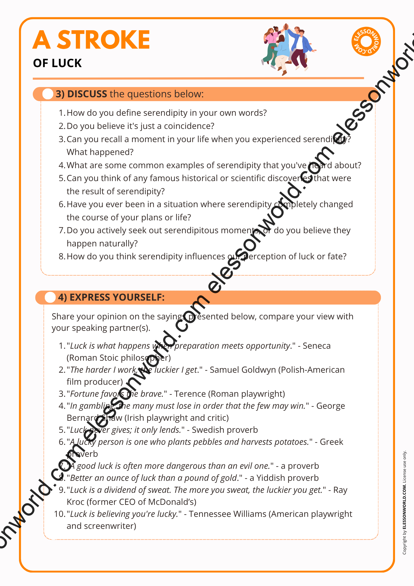 This B2-C1 ESL lesson on serendipity and luck explores how chance events shape our lives, introducing phrases like “a long shot,” “twist of fate,” and “blessing in disguise.” The lesson is available in both printable format for traditional classrooms and a digital 16:9 PDF presentation. The user-friendly digital format allows easy navigation in presentation mode with just a click of the spacebar, requiring no additional software.