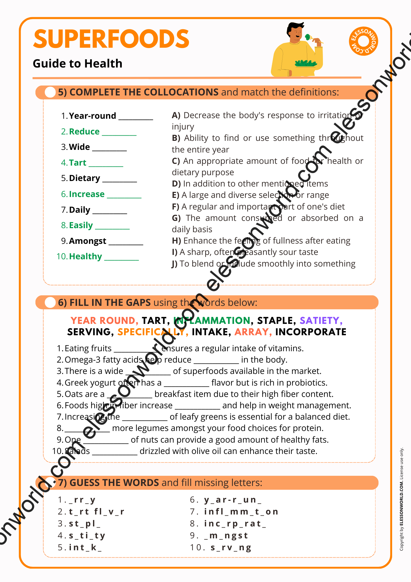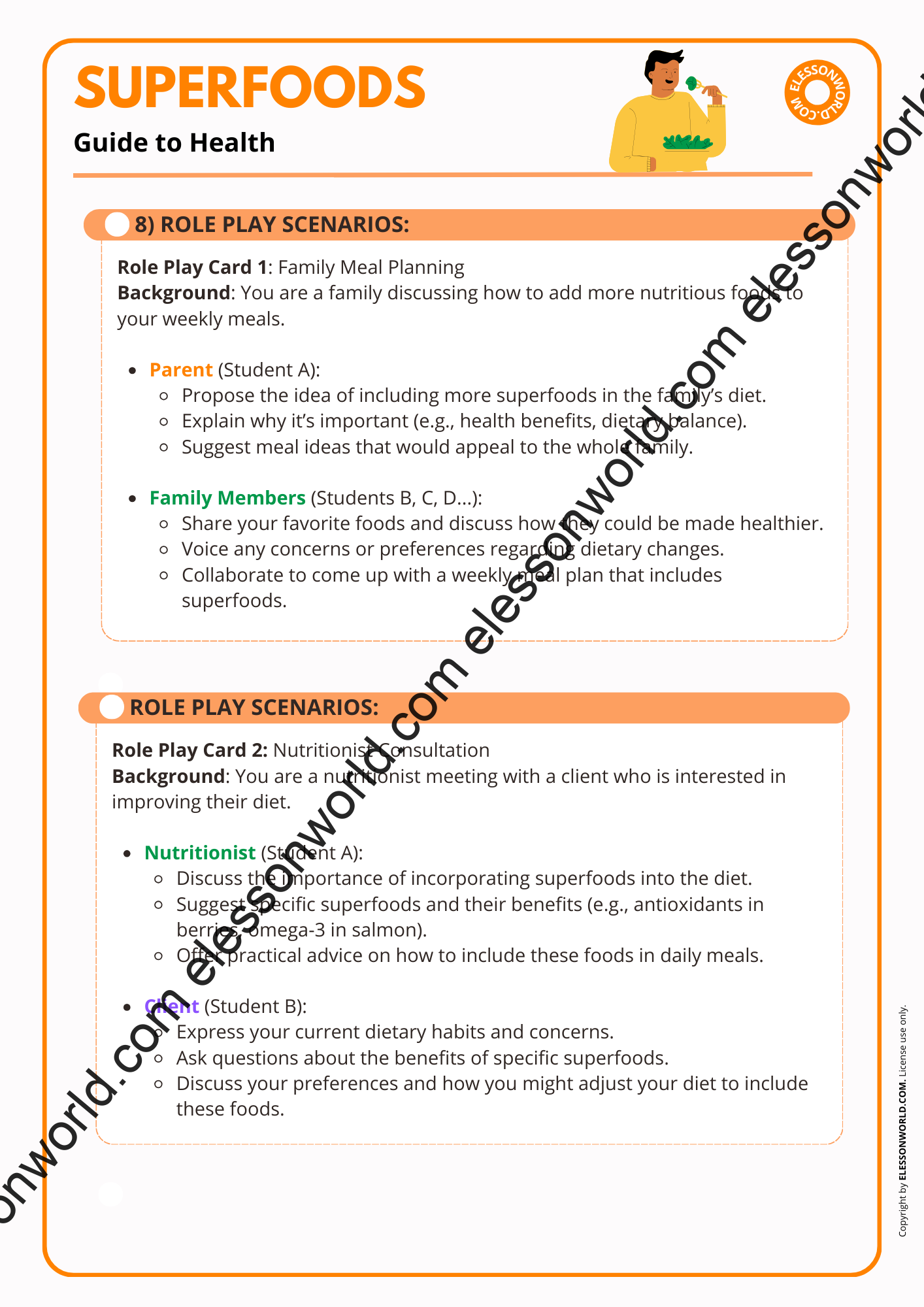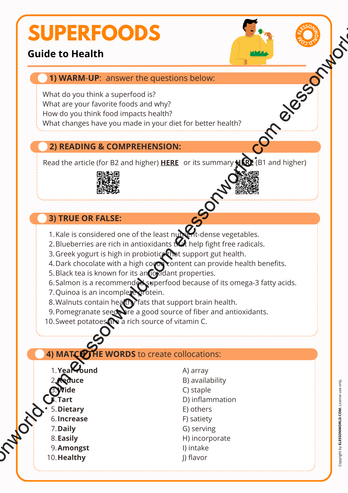This B2-C1 level ESL lesson is designed to educate students on the concept of superfoods and their impact on health. The lesson is available in both printable format for traditional classrooms and a digital 16:9 PDF presentation. The user-friendly digital format allows easy navigation in presentation mode with just a click of the spacebar, requiring no additional software.
