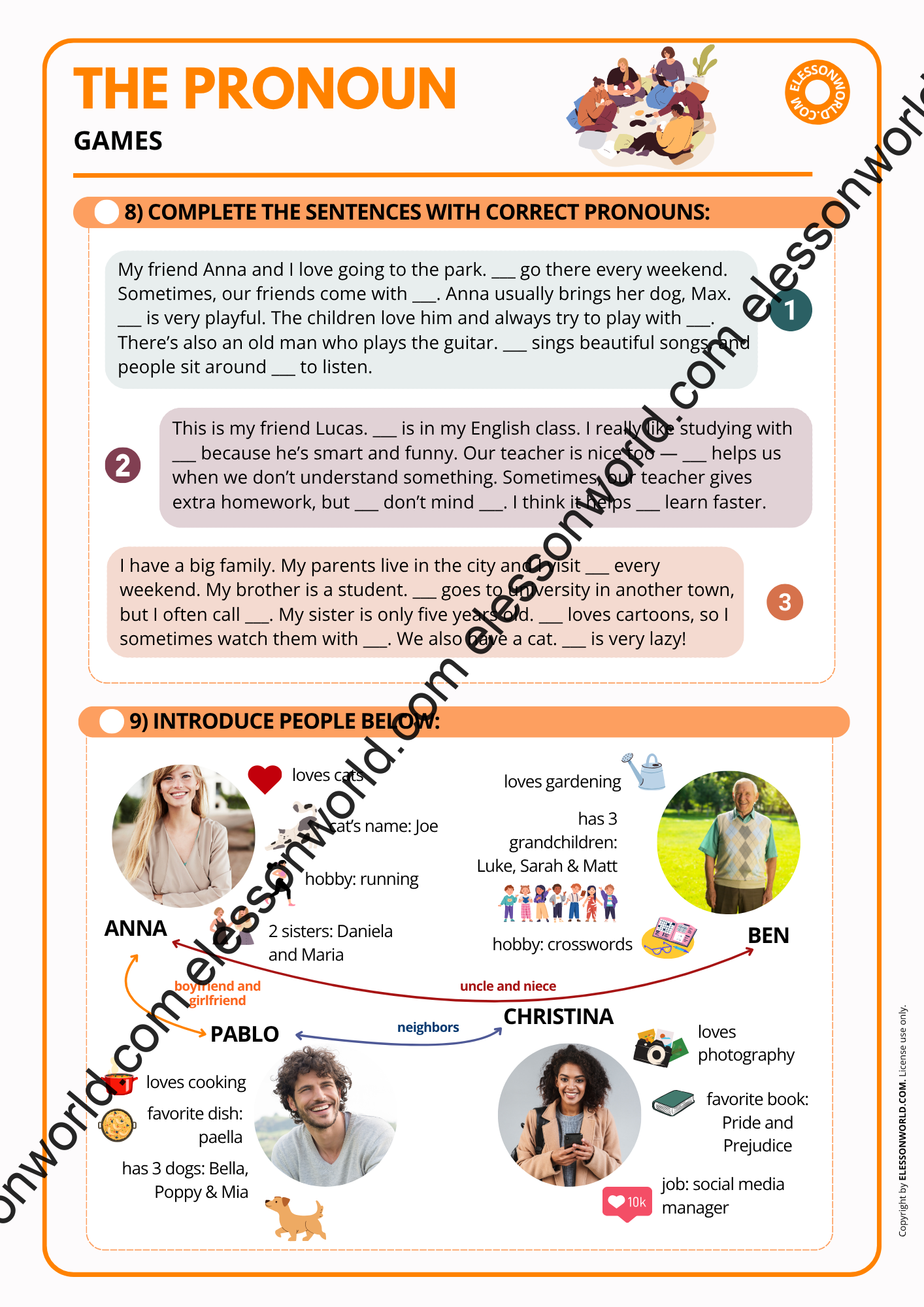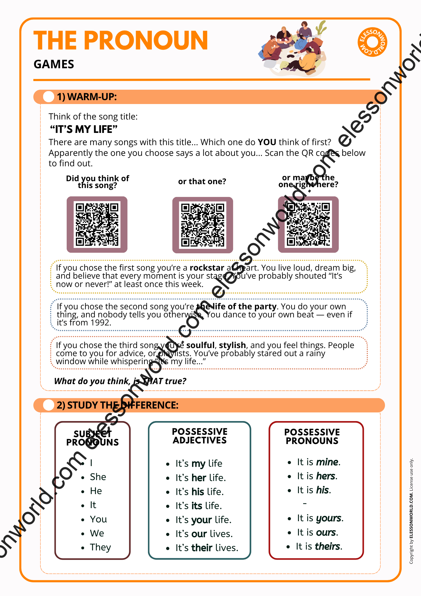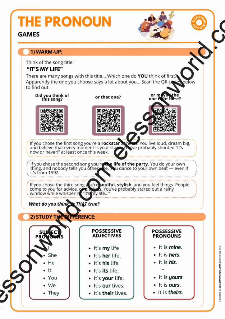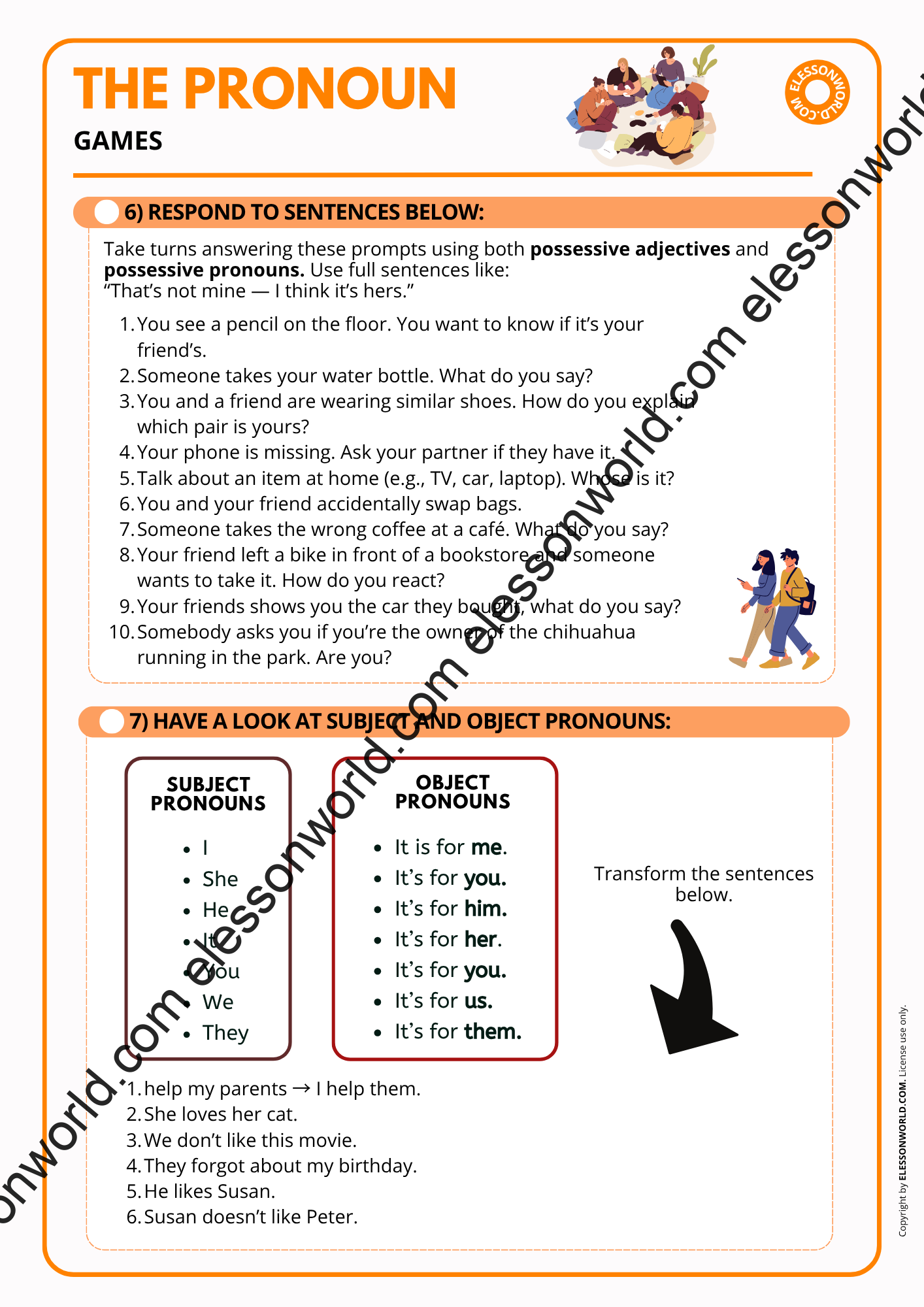 This A1–A2 ESL lesson introduces and practices essential English pronouns in a fun and interactive way. Students learn to use subject pronouns (he, she, we), object pronouns (me, him, them), possessive adjectives (my, your, their), and possessive pronouns (mine, yours, hers) through matching games, dialogues, short stories, and speaking activities. The lesson builds a strong grammar foundation while promoting real-life communication and confidence with everyday language. The lesson is available in both printable format for traditional classrooms and a digital 16:9 presentation. The user-friendly online format allows easy navigation in presentation mode with just a click of the spacebar, requiring no additional software.