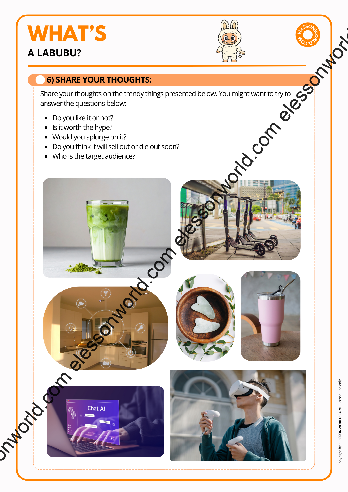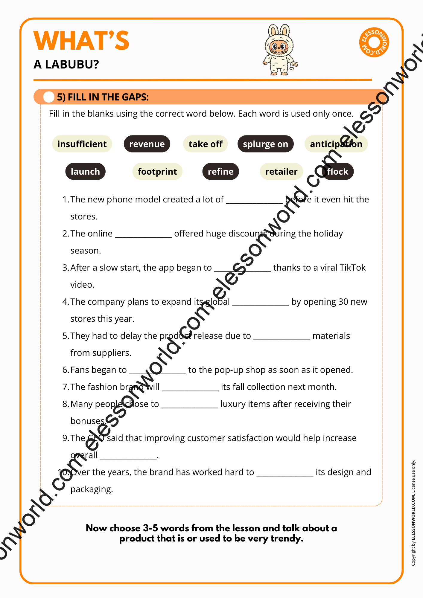 This B1–B2 ESL lesson dives into the colorful world of blind boxes and collectible culture through the quirky and viral toy character Labubu. Students explore marketing vocabulary, consumer behavior, and the psychology of collecting while practicing speaking, listening, and reading skills. The lesson is available in both printable format for traditional classrooms and a digital 16:9 PDF presentation. The user-friendly digital format allows easy navigation in presentation mode with just a click of the spacebar, requiring no additional software.