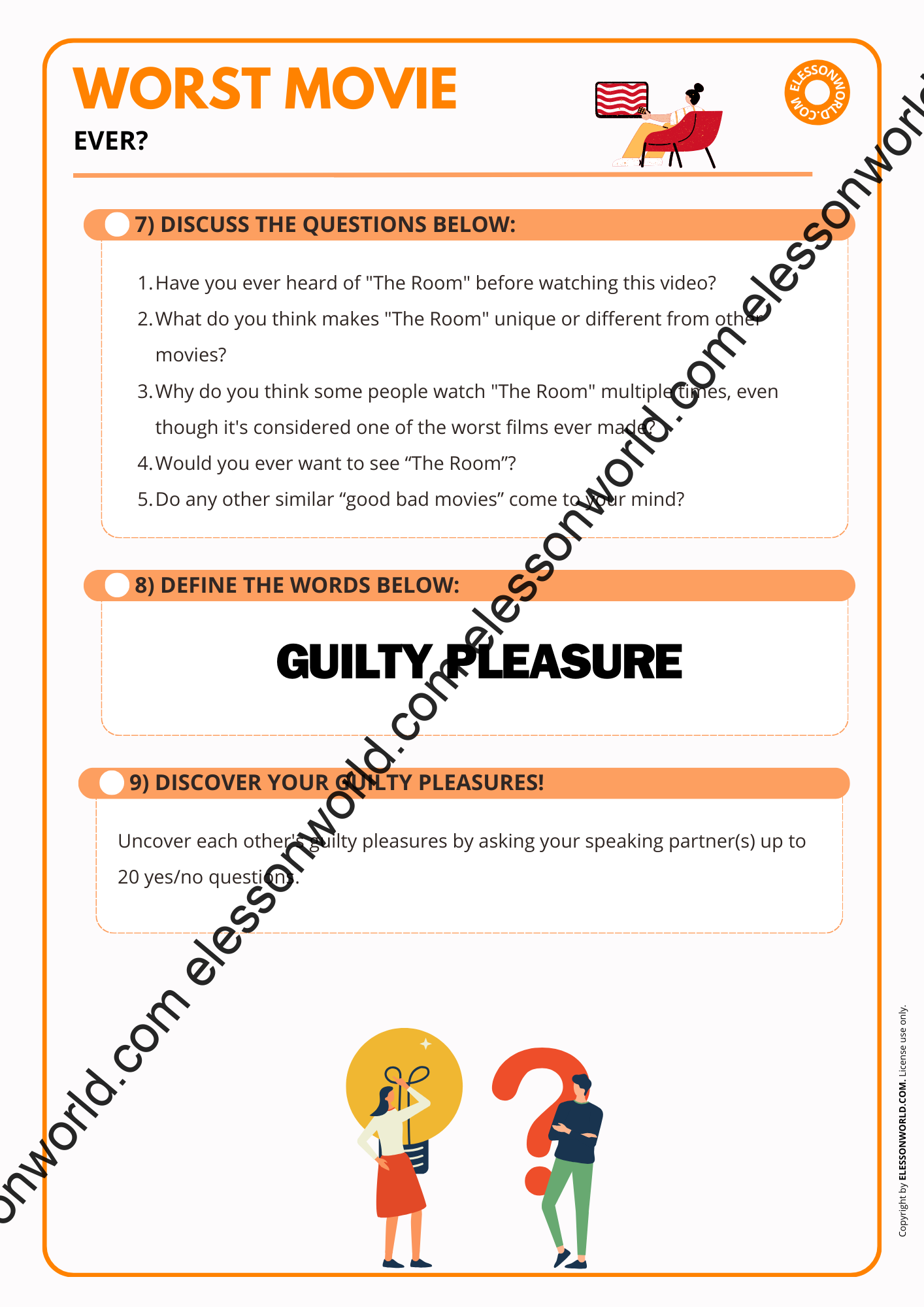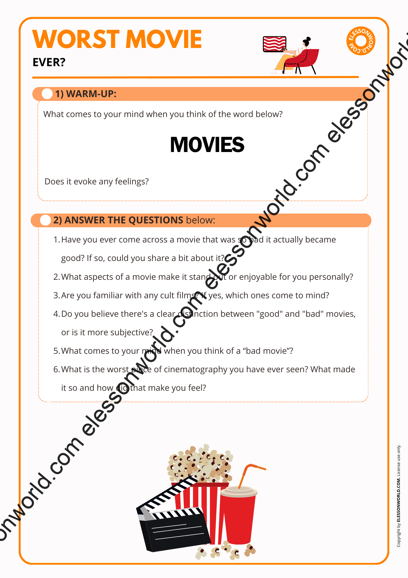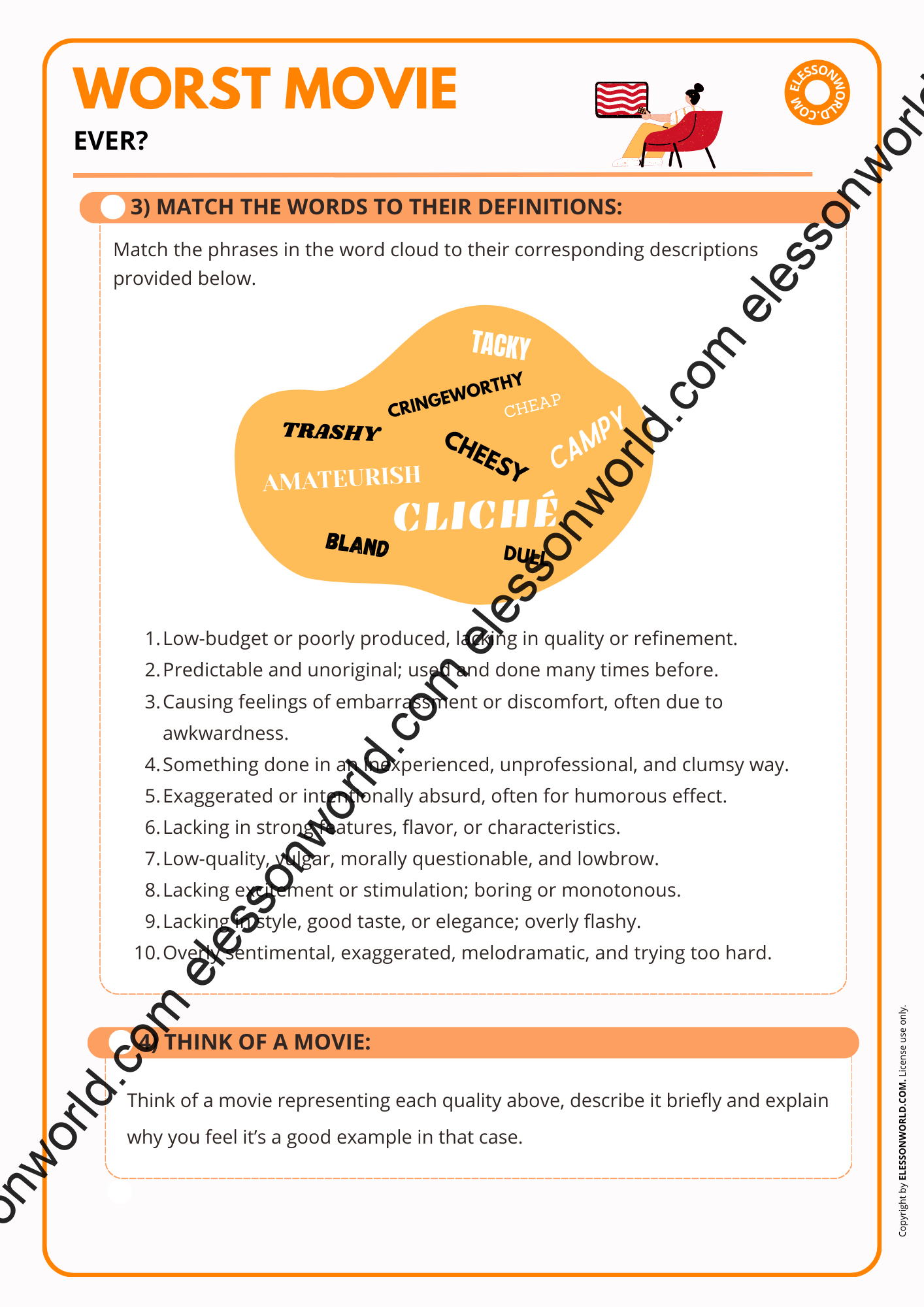 This B2-C1 level ESL lesson invites students to explore the concept of movies that are widely considered bad yet have gained popularity for various reasons. The lesson focuses on what makes a film notorious or unsuccessful in conventional terms but still enjoyable or interesting to certain audiences. The lesson is available in both printable format for traditional classrooms and a digital 16:9 PDF presentation. The user-friendly digital format allows easy navigation in presentation mode with just a click of the spacebar, requiring no additional software.